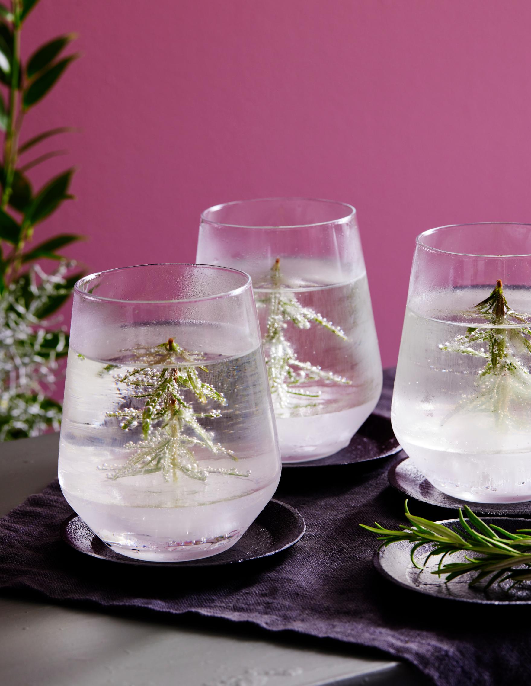Valmista alkujuomaksi huurteisen kauniit spritzerit, joissa rosmariininoksa jäädytetään kuuseksi lasin pohjalle.