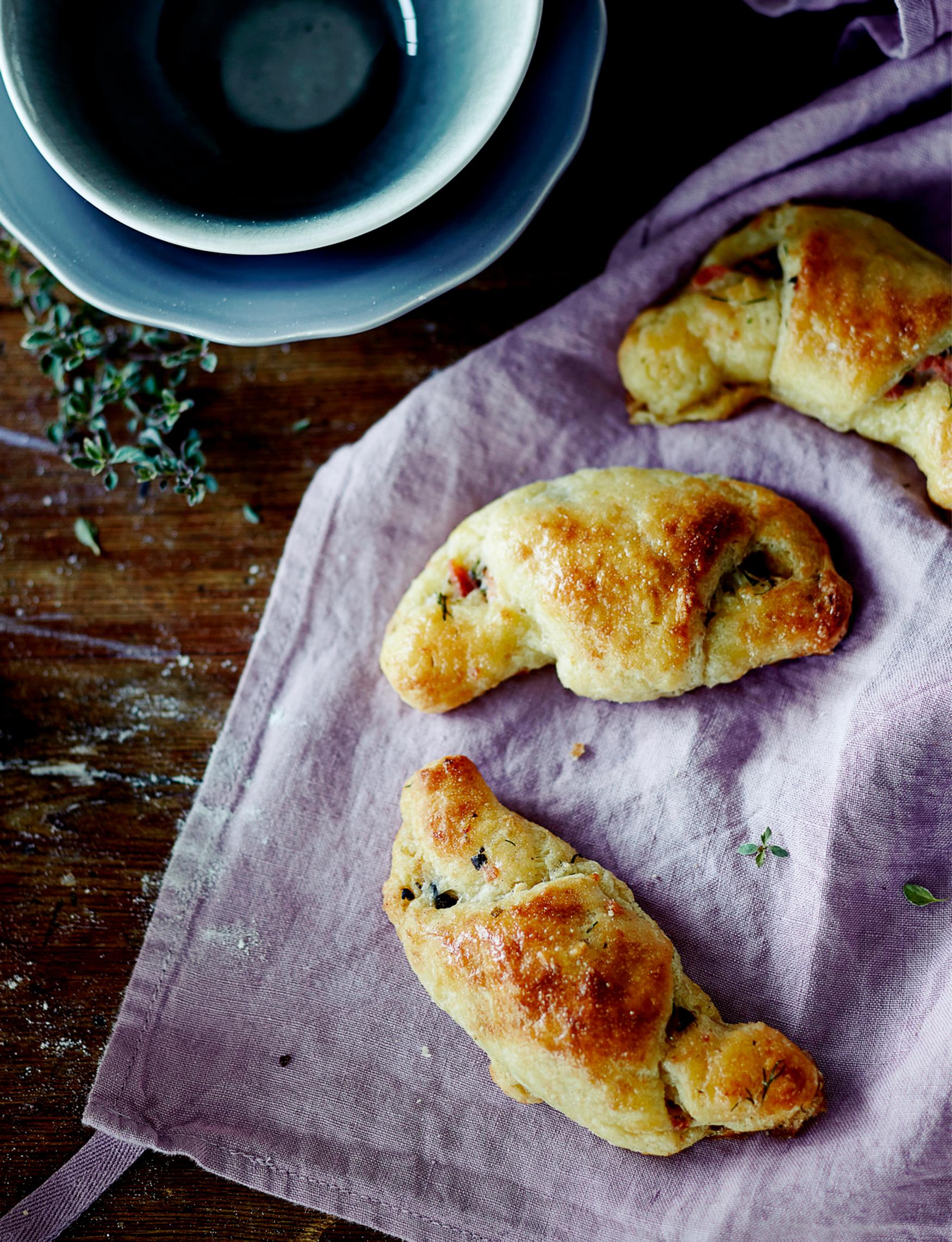 Jaa ympyrät kahdeksaan kolmioon. Nosta täytettä kolmion leveään päähän. Kääri kolmiot rullalle leveästä päästä alkaen. Taivuta rulla sarven muotoon leivinpaperin päälle pellille.