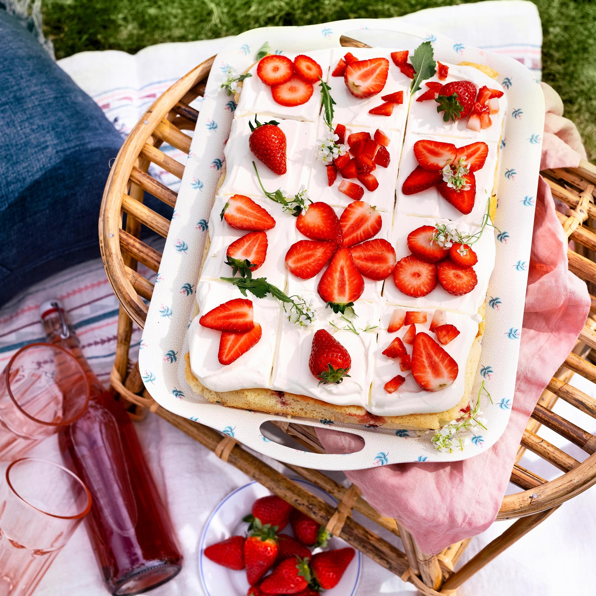 Laiskan leipurin mansikkakakku valmistuu helposti ilman kerroksia – kesäherkun viimeistelee raikas jogurttikerma