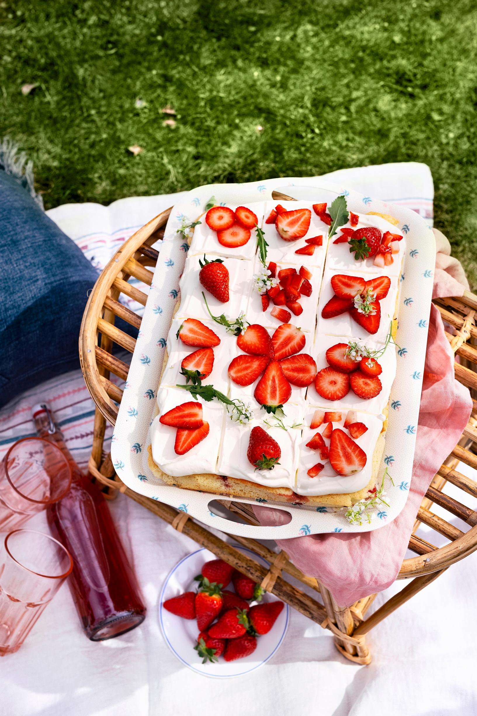 - Jaa pinta neliöiksi ja koristele ne kokonaisilla ja paloitelluilla mansikoilla sekä kukilla.