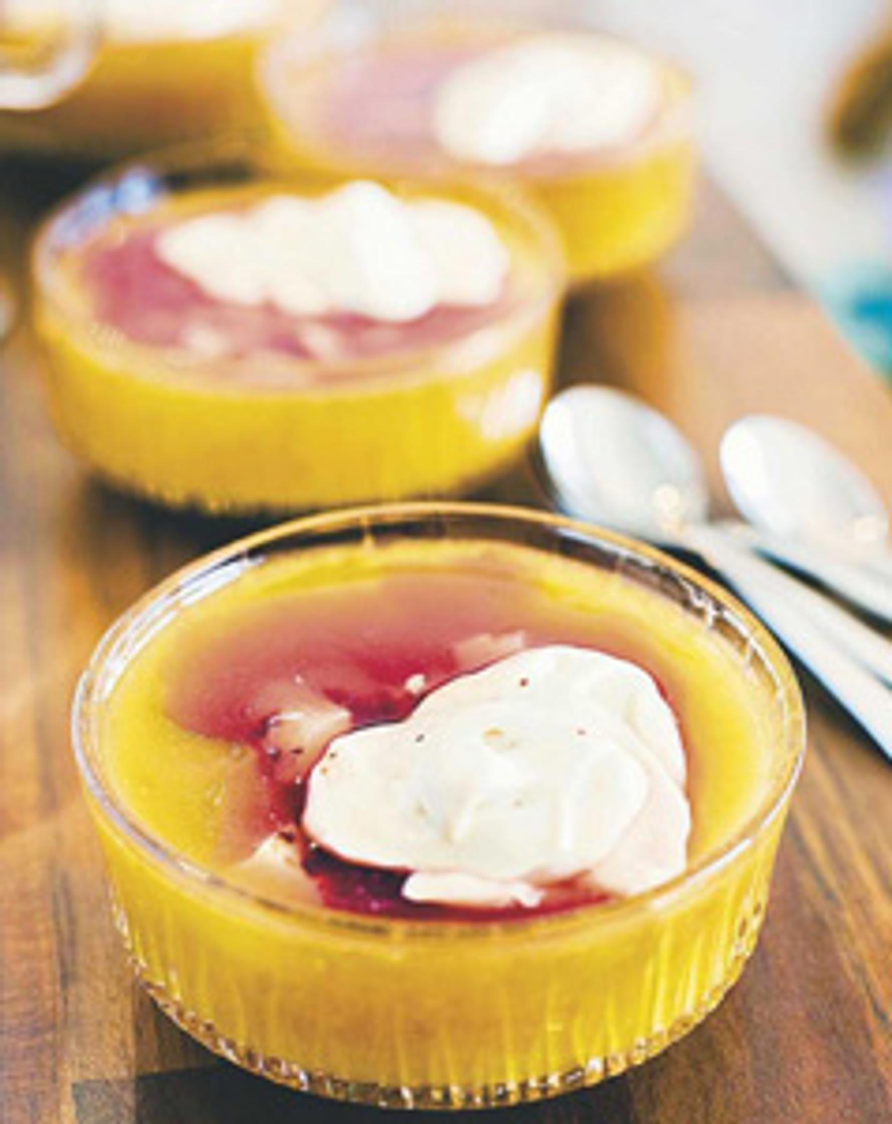 Lusikoi maljoihin ensin lakkakiisseliä, sitten juustopaloja, päälle karpalokastiketta ja kruunuksi rahkausvaa.