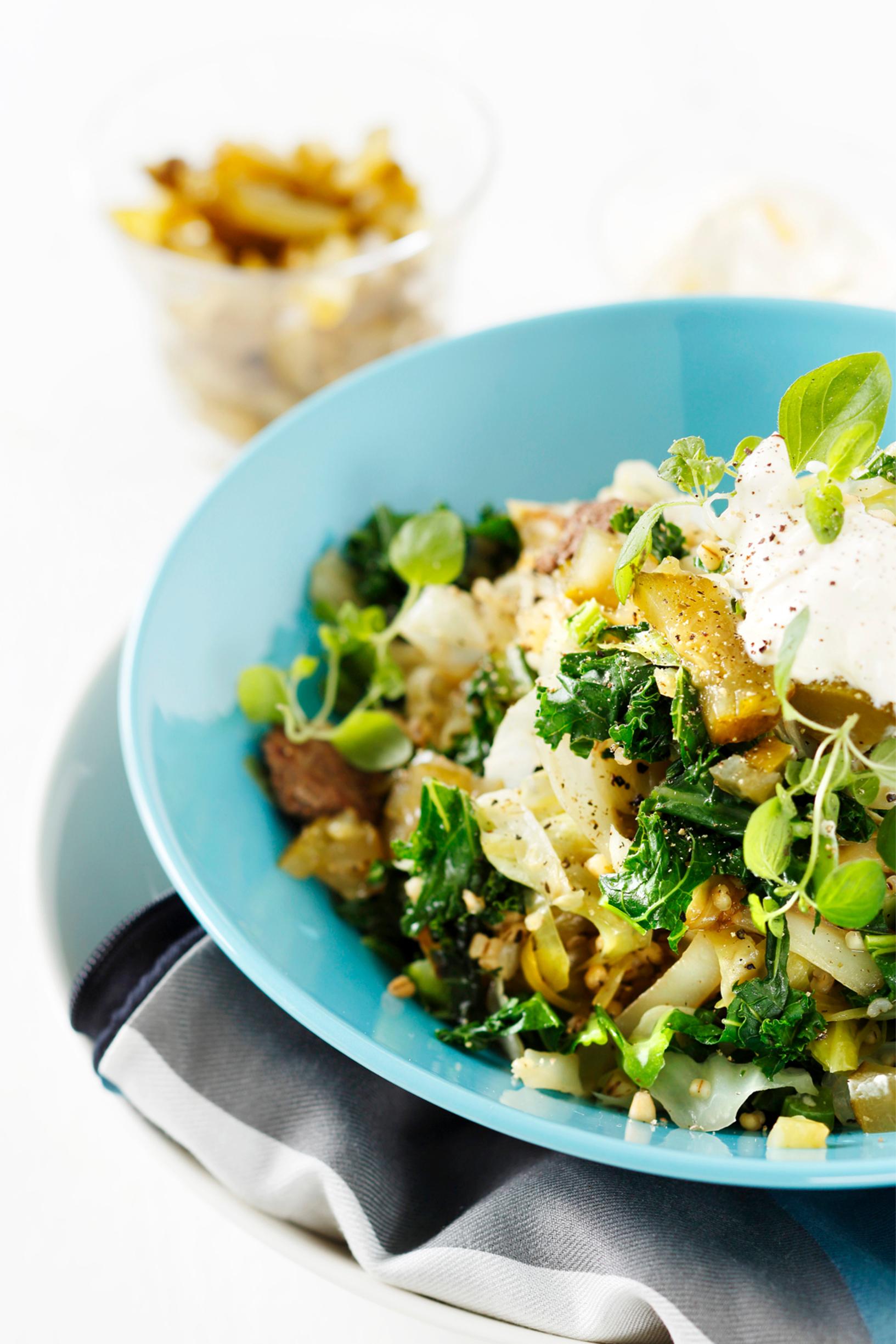 - Tarjoa lammas-kaalipata smetanan ja silputun maustekurkun kanssa.