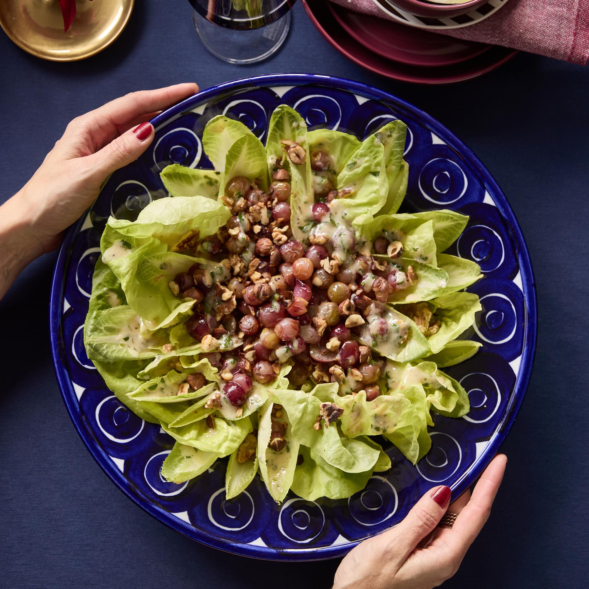 Lämpimät viinirypäleet, paahdetut pähkinät ja yrttinen sinappikastike tekevät salaatista ihanan talvisen herkun. Rapealehtiset salaattilajikkeet kestävät kauniisti rypäleiden lämmön.