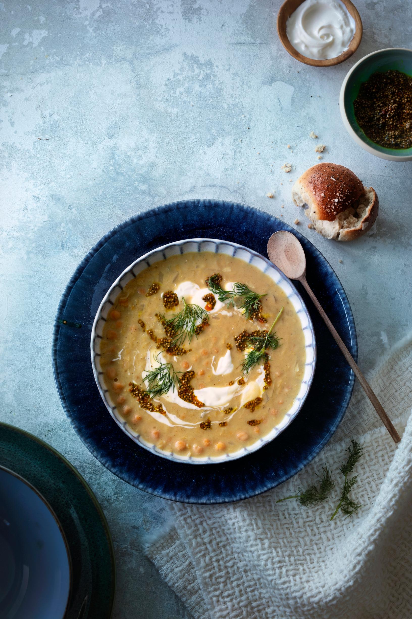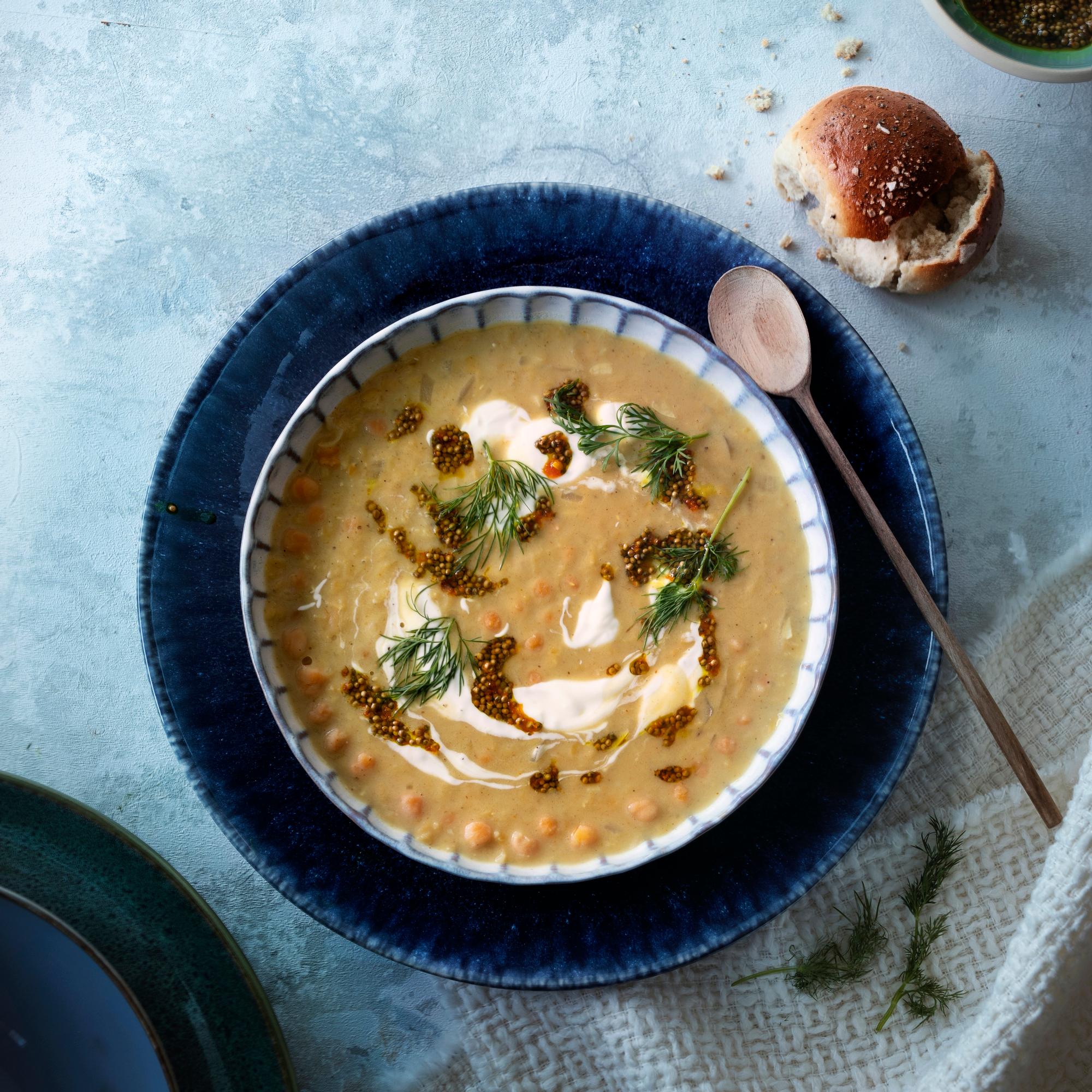 Helppo kikherne-linssikeitto saa säväyksen sinappisesta mausteöljystä, tillistä ja jogurttinokareesta