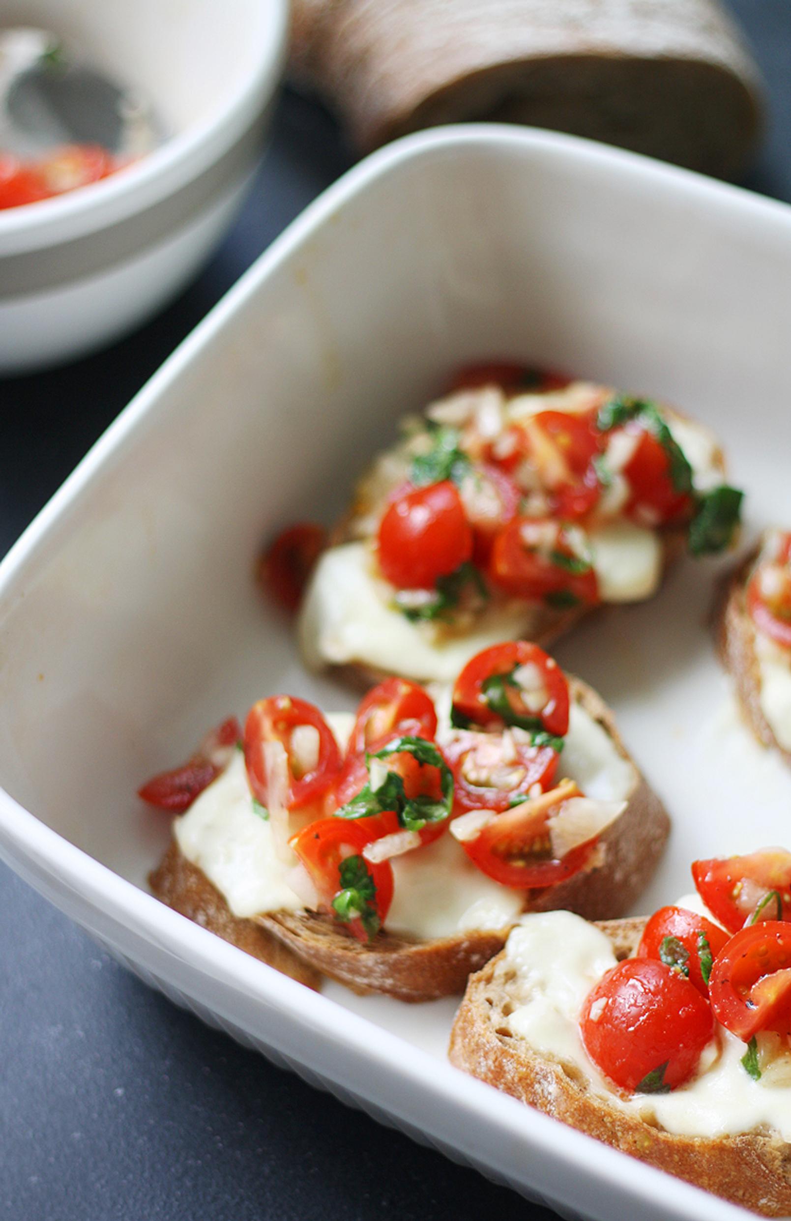 Klassisesta bruschetasta saa ruokaisamman version paahtamalla leivän uunissa mozzarellan kera. Lämpimät mozzarella-bruschetat ovat uskomattoman herkullinen alkupala!