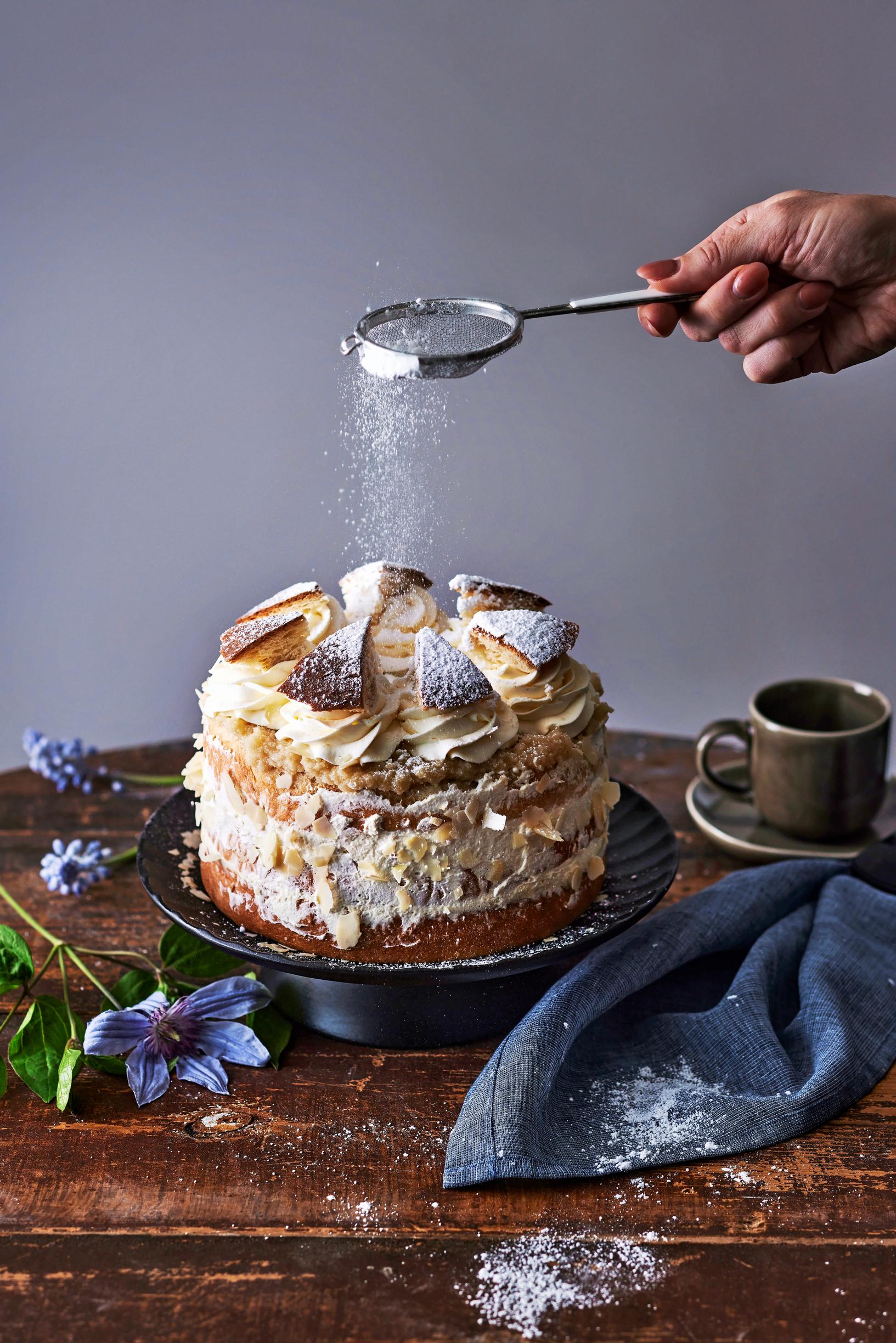 - 13Koristele laskiaiskakku lopuksi mantelilastuilla ja sihtaa päälle tomusokeria.