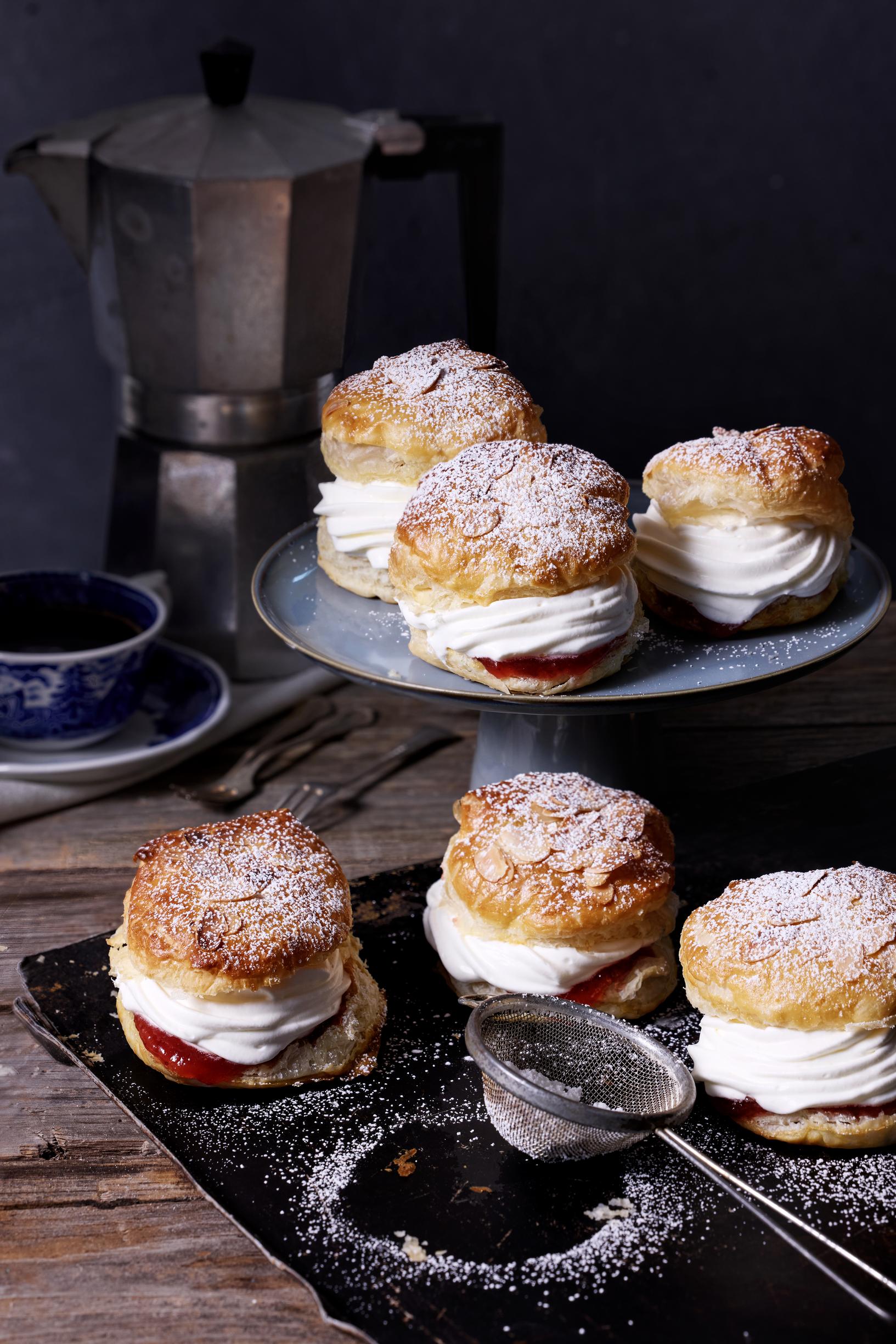 - Leikkaa voitaikinapullapohjista hattu pois sahateräisellä veitsellä. Lusikoi mansikkahilloa pohjalle ja pursota kermavaahto päälle. Nosta lakki takaisin ja viimeistele tomusokerilla. Tarjoa heti.