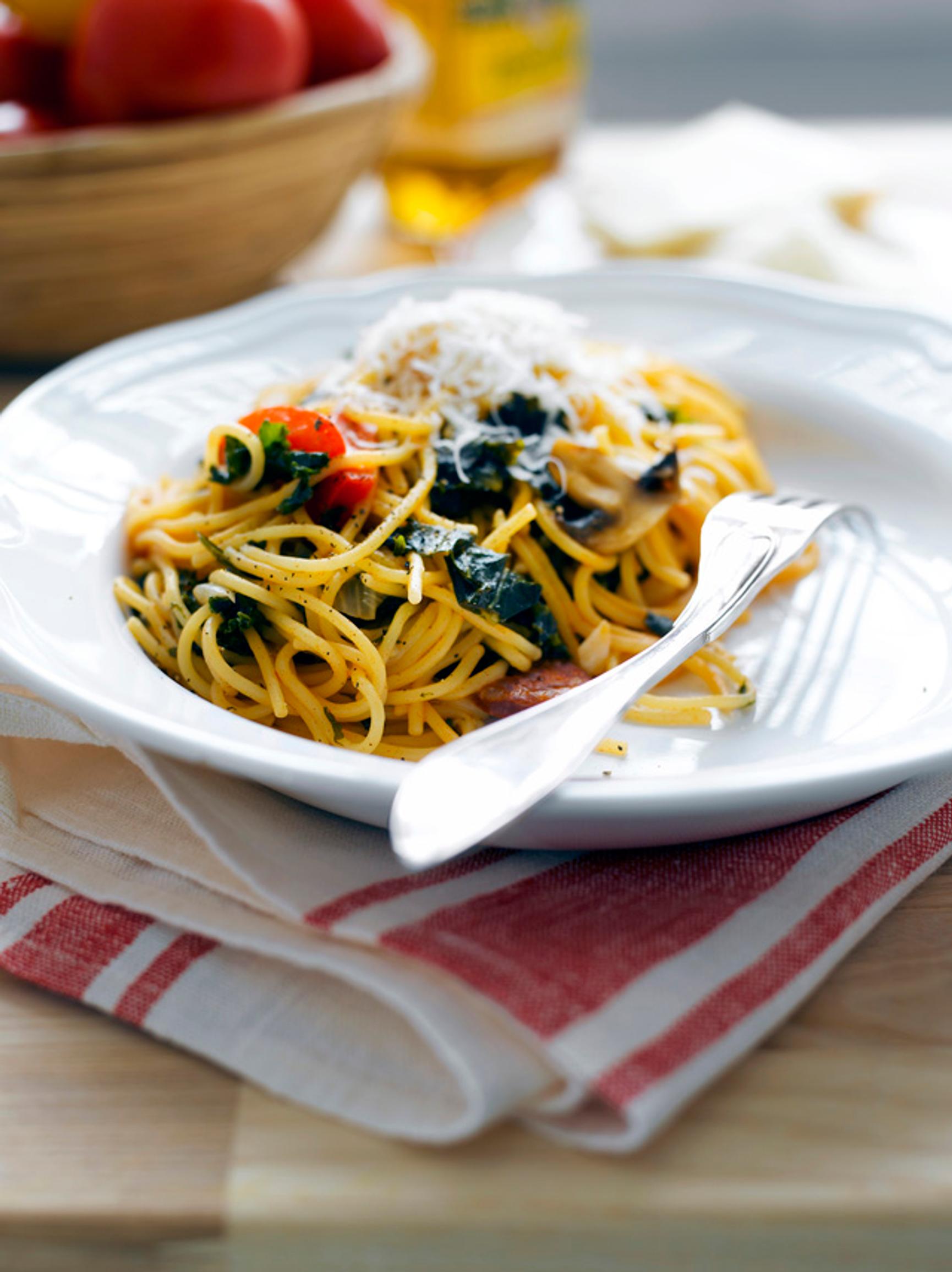 Tämä chorizopasta on paitsi herkullinen myös superkätevä ruoka, sillä se valmistuu yhdessä kattilassa. Mausteinen chorizomakkara saa pastassa seurakseen maukasta ja terveellistä lehtikaalia.