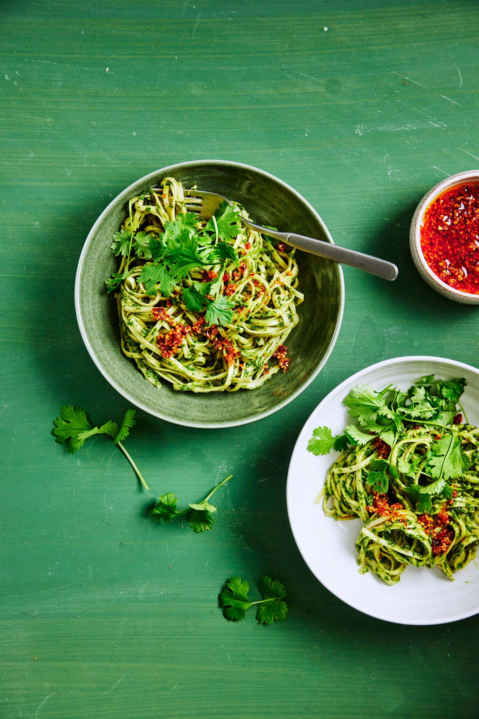 - Keitä nuudelit pakkauksen ohjeen mukaan. Sekoita lehtikaaliseos nuudeleihin. Viimeistele annokset rapealla valkosipuli-chiliöljyllä ja korianterilla.