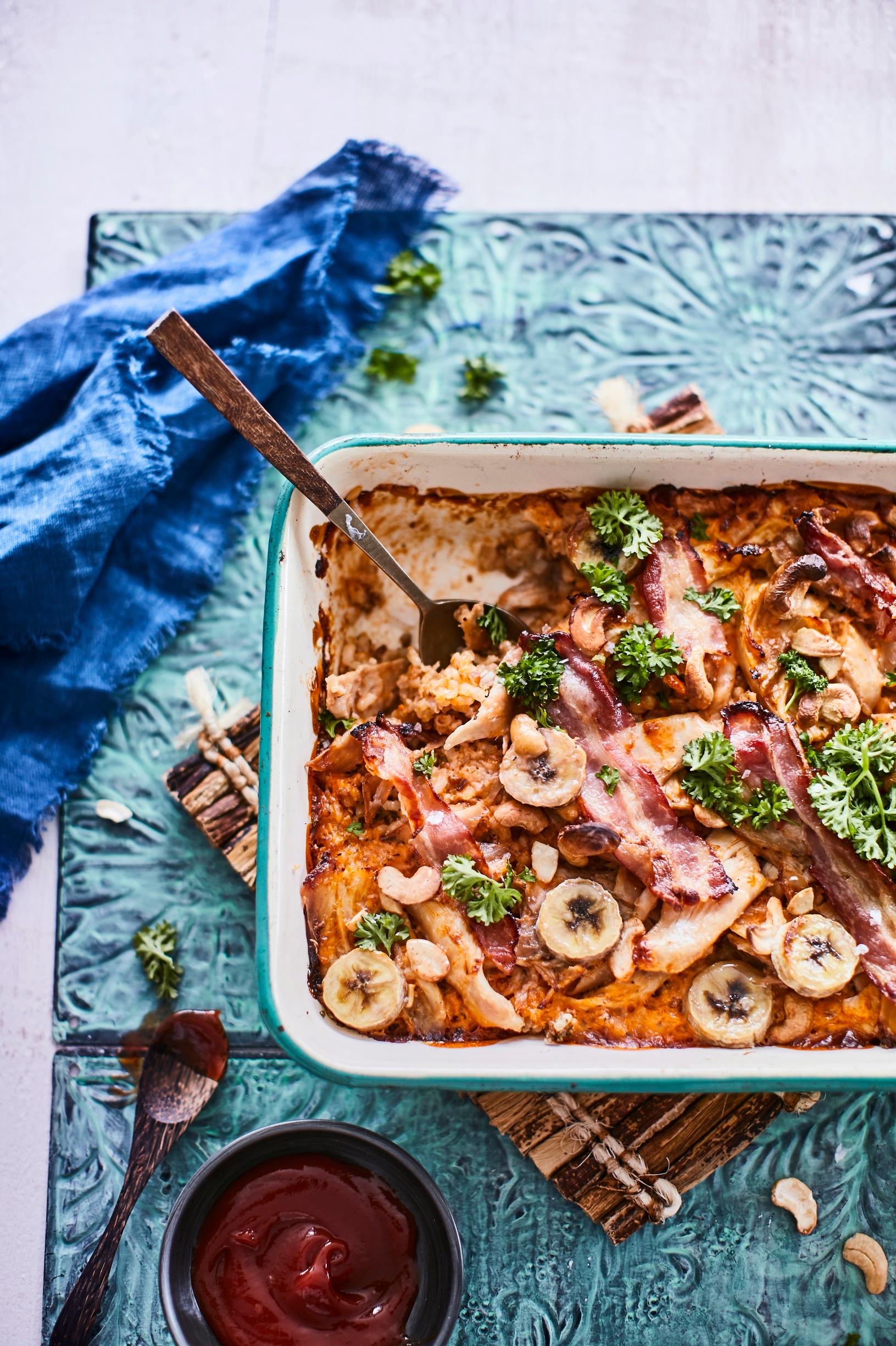 - Vatkaa kerma löysäksi vaahdoksi, sekoita joukkoon chilikastike. Kaada kermaseos broilerin päälle. Lisää pinnalle viipaloidut banaanit ja pekonit joko kokonaisina tai silputtuina. Ripottele pinnalle pähkinät.