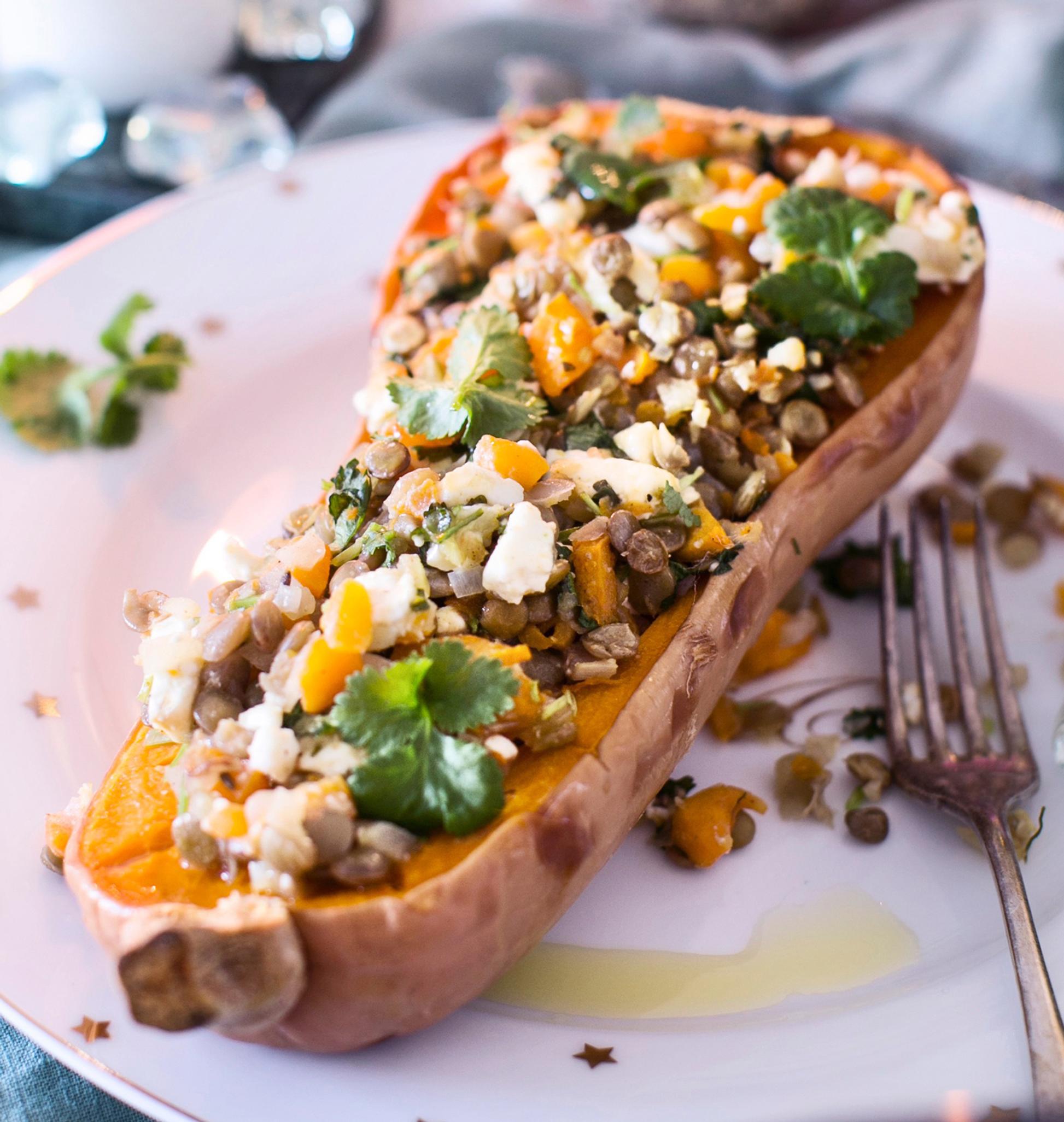 Myskikurpitsa täytetään marokkolaisittain maustetuilla linsseillä, korianterilla ja fetajuustolla.
