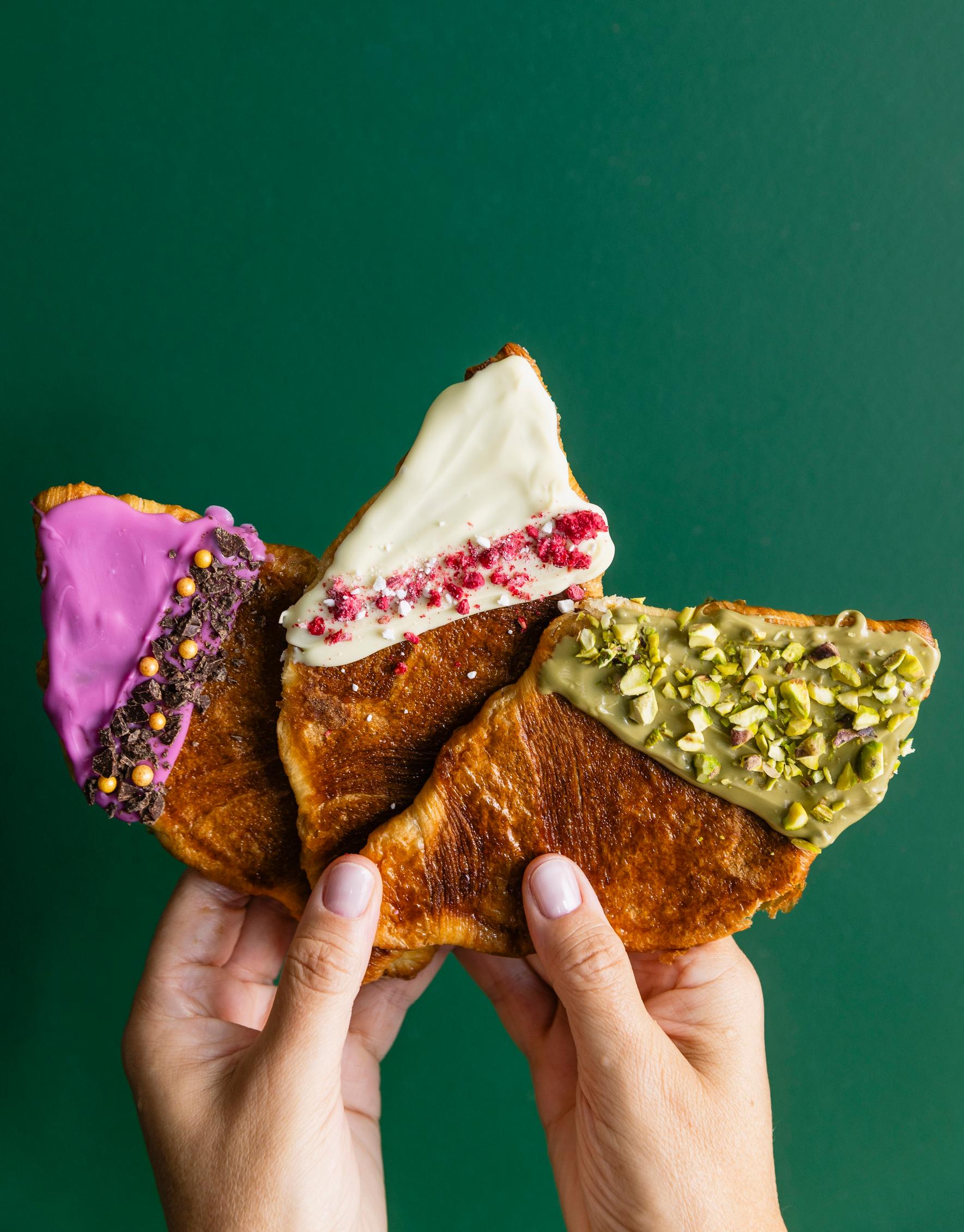 Somessa villinneet litistetyt croissantit valmistuvat helposti valmiista raakapakasteista. Kokeile kuorrutuksessa sulatetun suklaan ja pistaasitahnan lisäksi myös keksitahnaa ja nutellaa. Koristellut lyttycroissantit ovat hauska vaihtoehto vaikka piparkakuille!