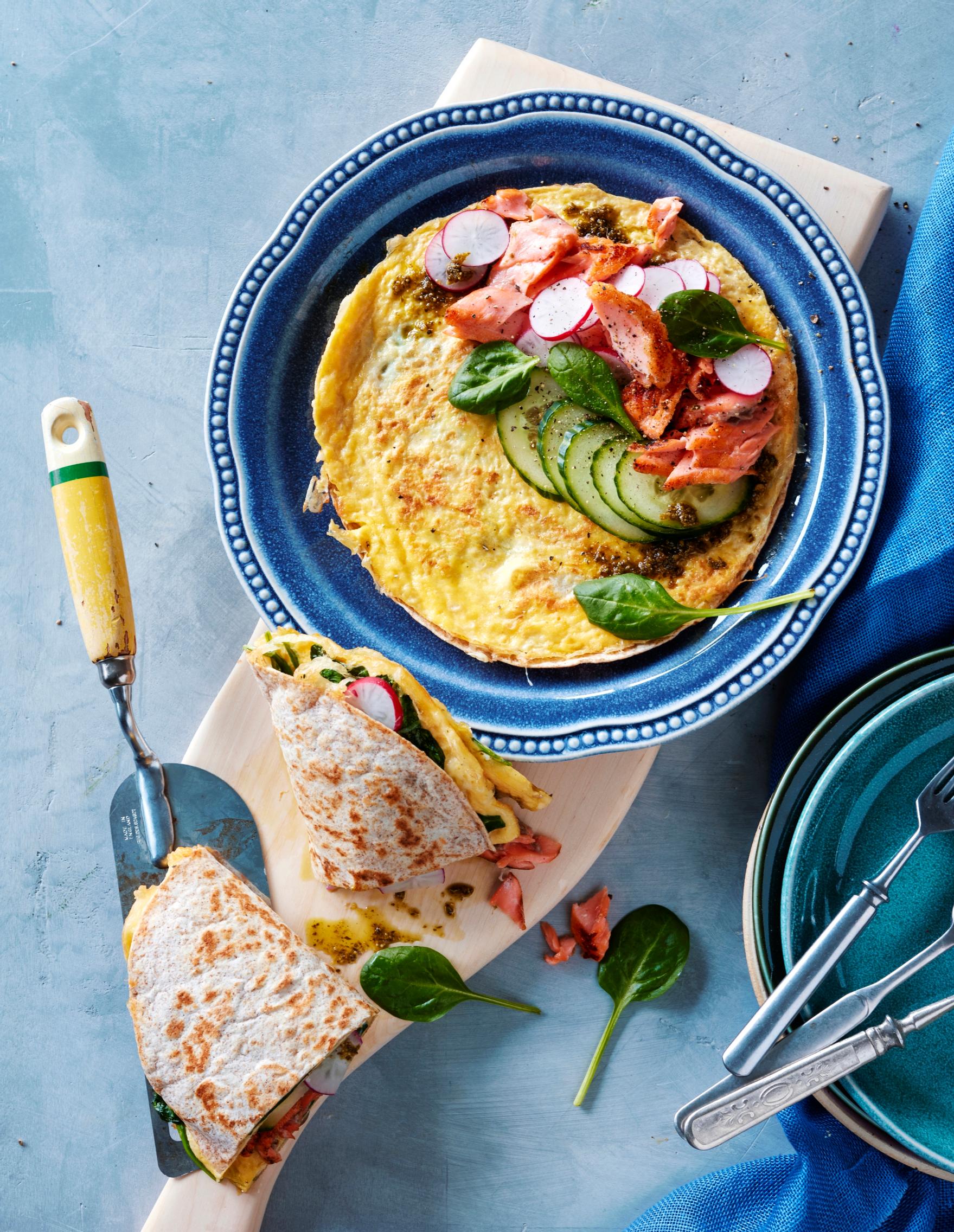 Näppärä välipala tai lounas syntyy, kun paistat munakkaan ja tortillan pannulla yhteen ja täytät lohella ja raikkailla vihanneksilla.