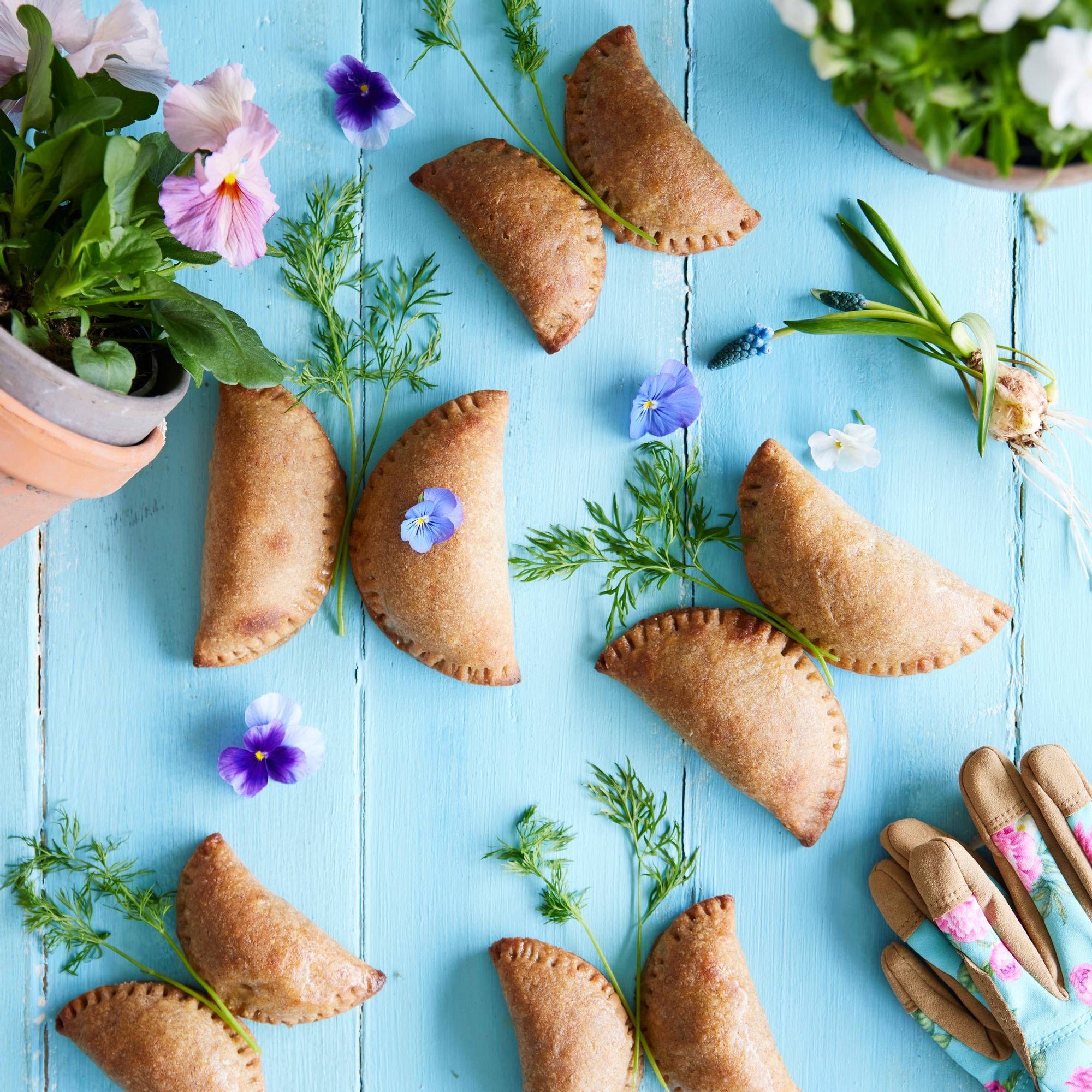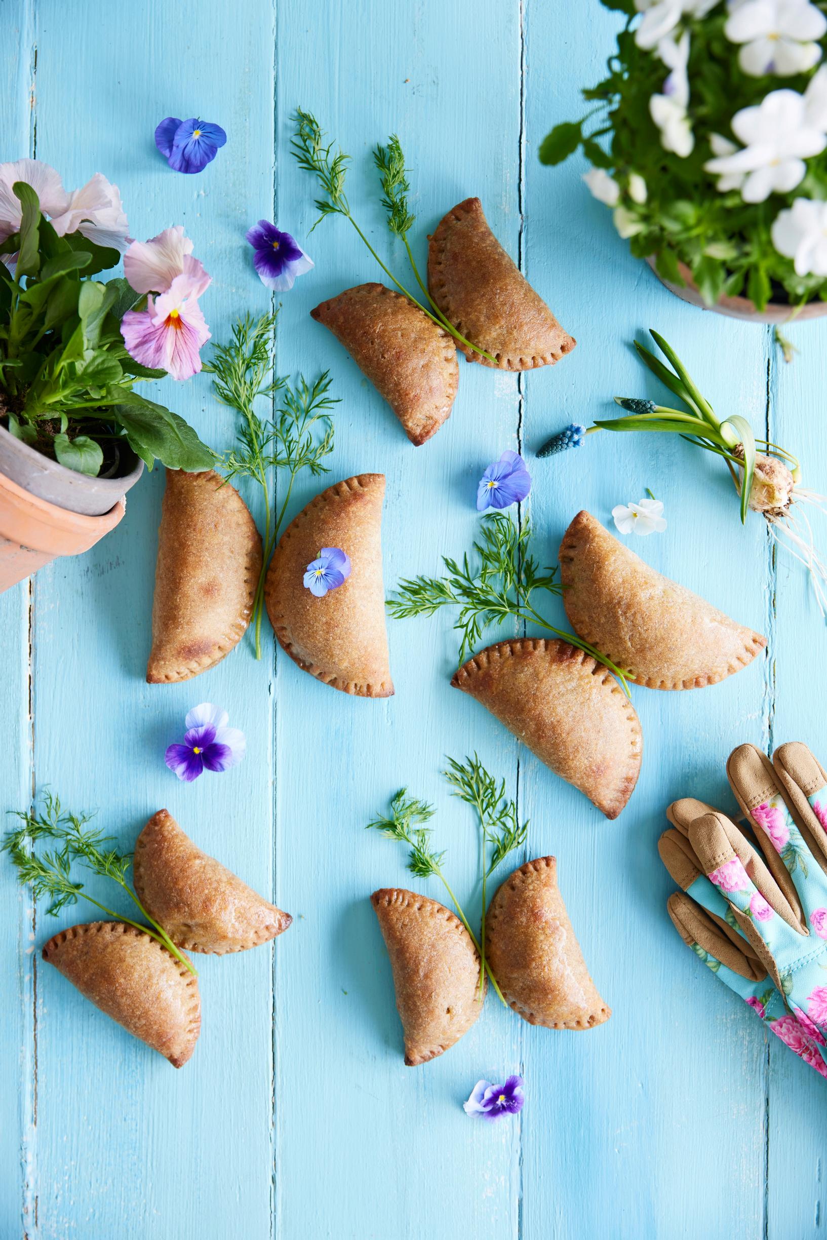 - Taita laidat vastakkain ja nipistele sormin tai painele haarukalla saumat kiinni. Siirrä pasteijat leivinpaperin päälle pellille. Kauli loppu taikina uudelleen levyksi ja jatka samaan tapaan.
