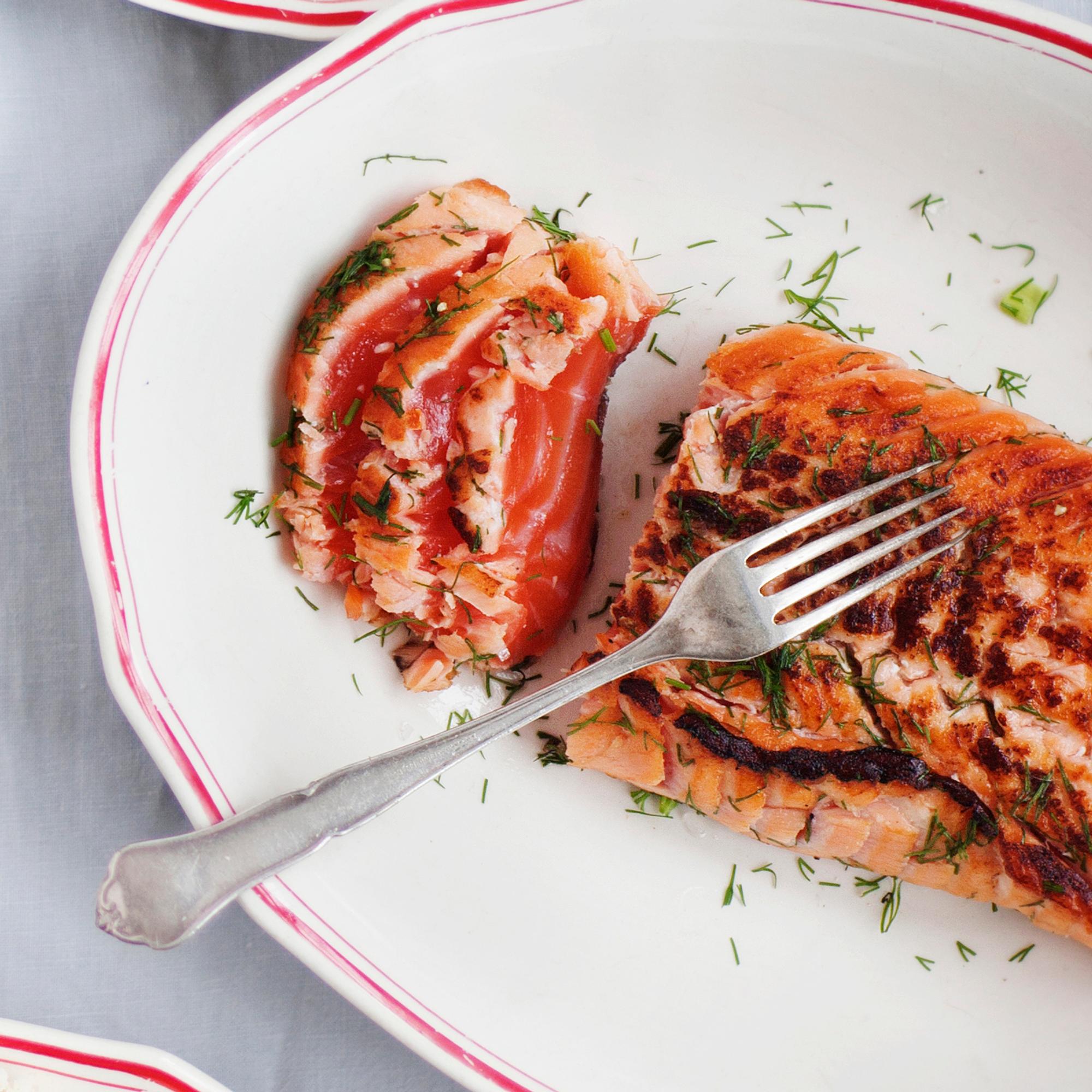 - Paahda lohipalaa kauttaaltaan hyvin kuumalla (valurauta) paistinpannulla tilkassa öljyä. Tarkoitus on, että pinta saa väriä ja paahdetun makua. Kalan ei kuulu kypsyä.