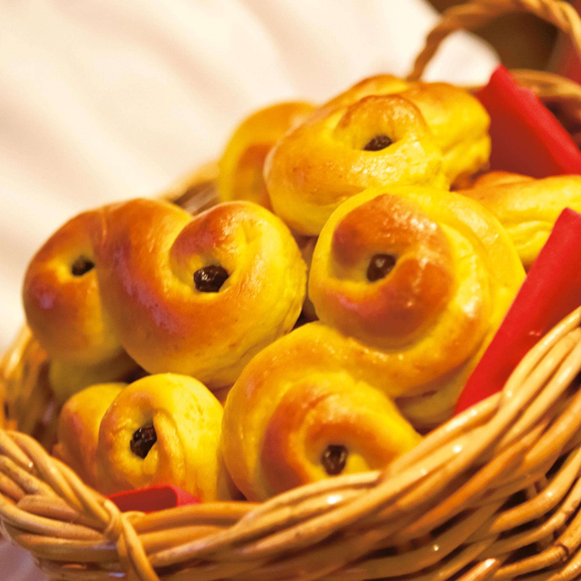 - Voitele luciapullat munalla ja koristele rusinoilla. Paista 225 asteessa 8–10 minuuttia.