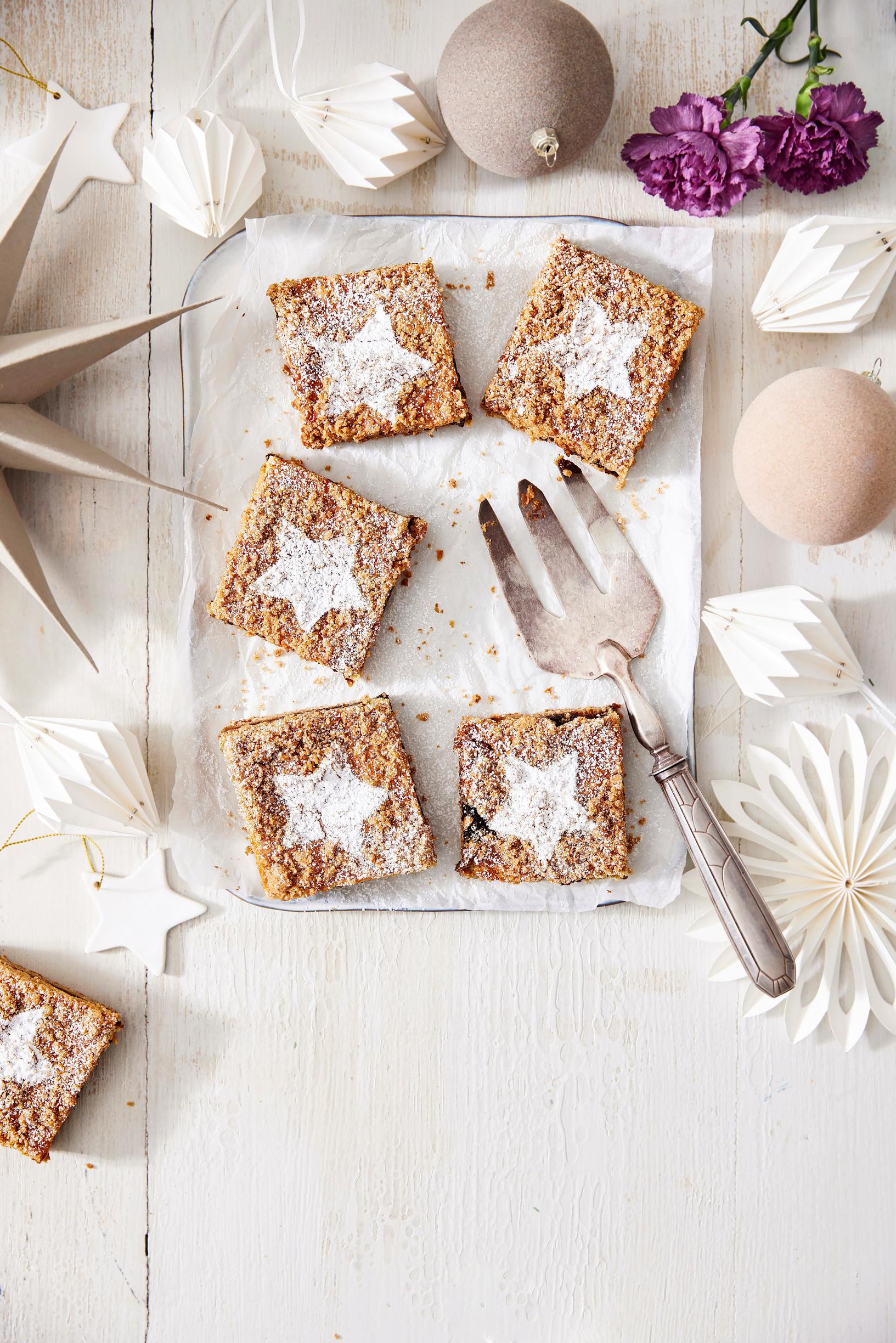 Korista pinta tomusokeritähdillä. Leikkaa leivinpaperiin tähden muotoisia aukkoja. Levitä paperi piirakan päälle ja siivilöi aukkoihin reilusti tomusokeria.
