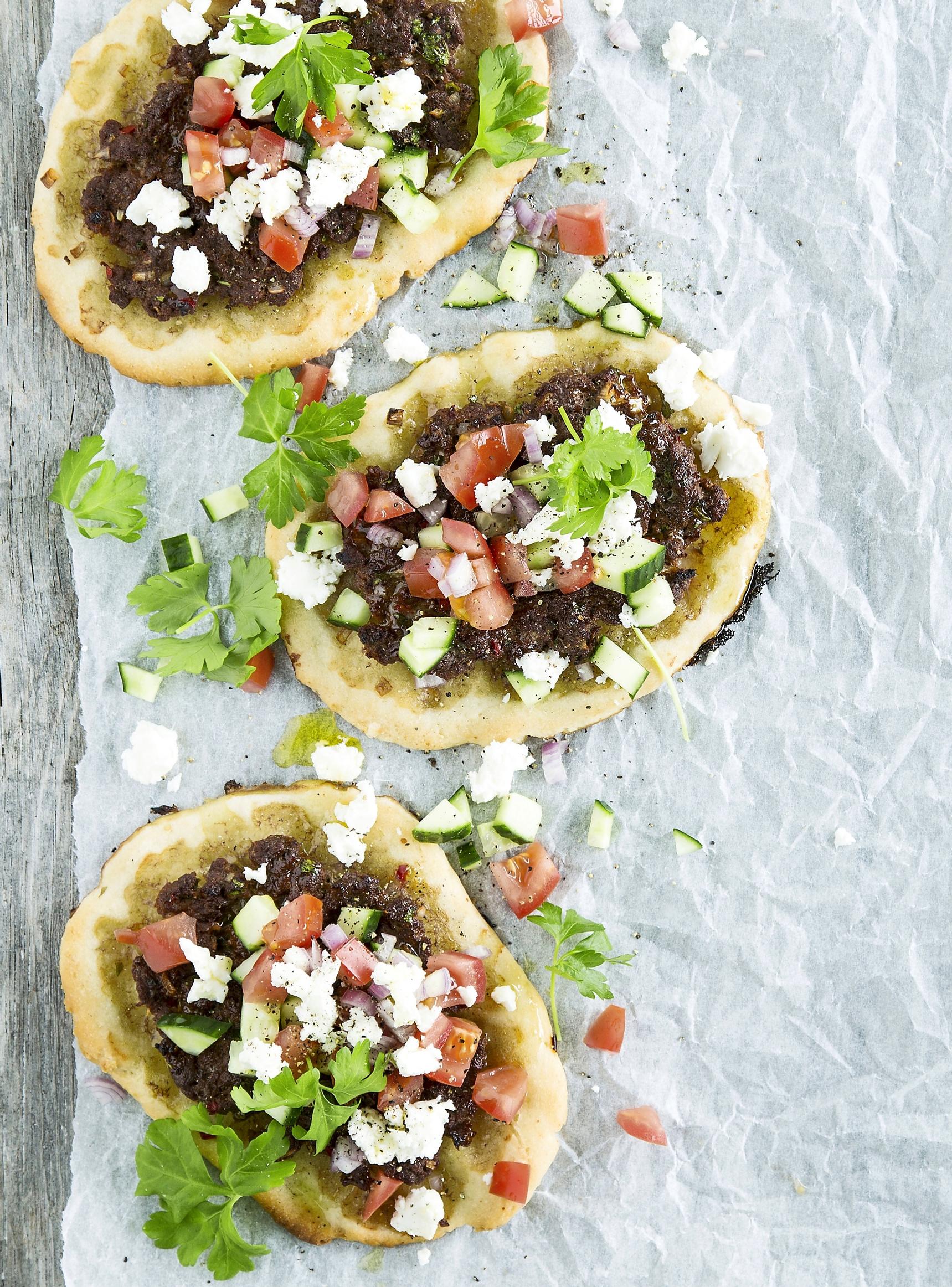 - Paista 250 asteessa noin 10 minuuttia tai kunnes täyte on kypsää ja reunat kauniin ruskeat. Murustele lahmacunin päälle fetaa.