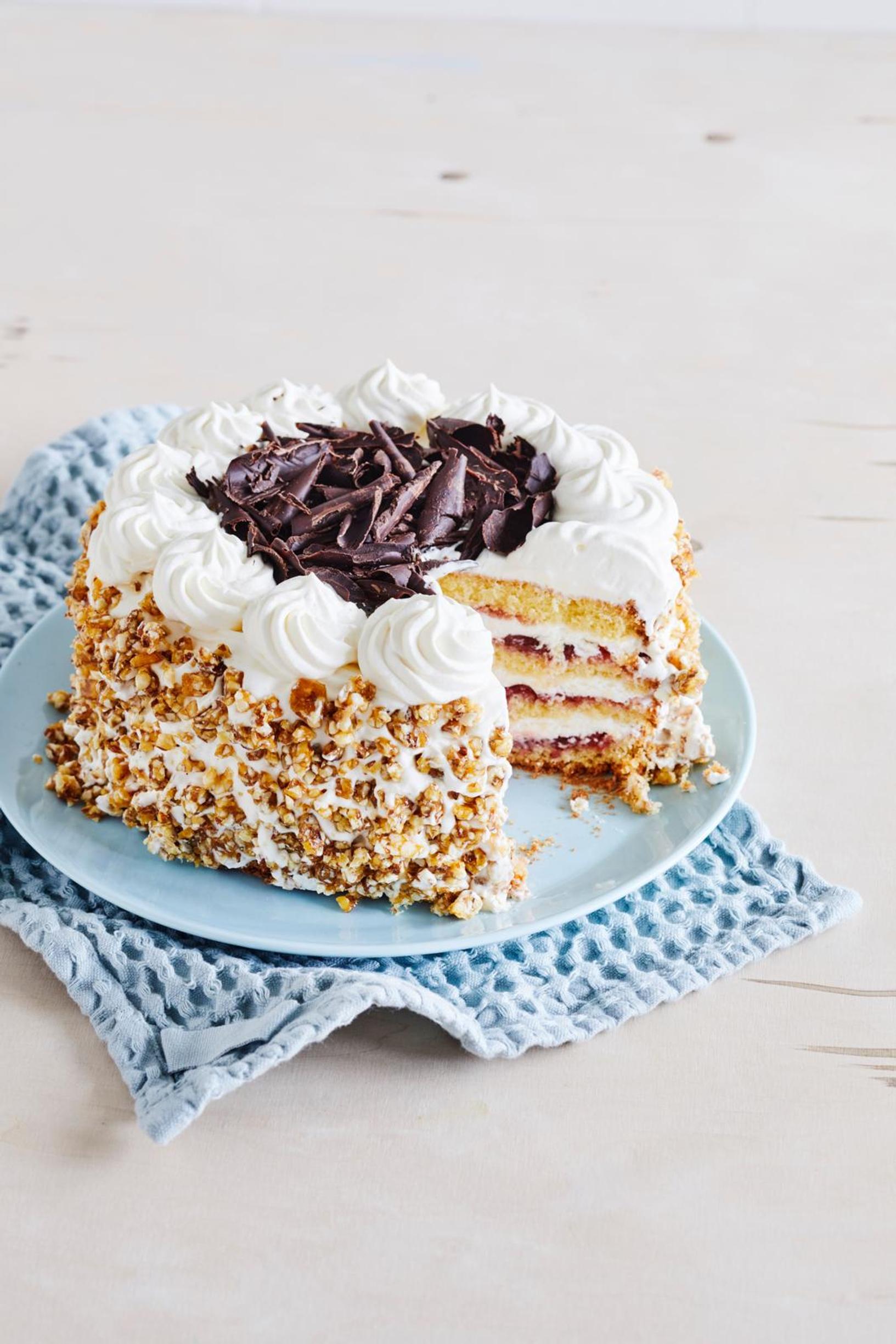 Maitoauton jäätelökakku täytetään mansikkahillolla ja vaniljajäätelöllä. Rapea mantelikrokantti ja suklaakiehkurat kruunaavat tämän lukijamme Outin 1980-luvulta inspiraationsa saaneen supersuositun herkun.