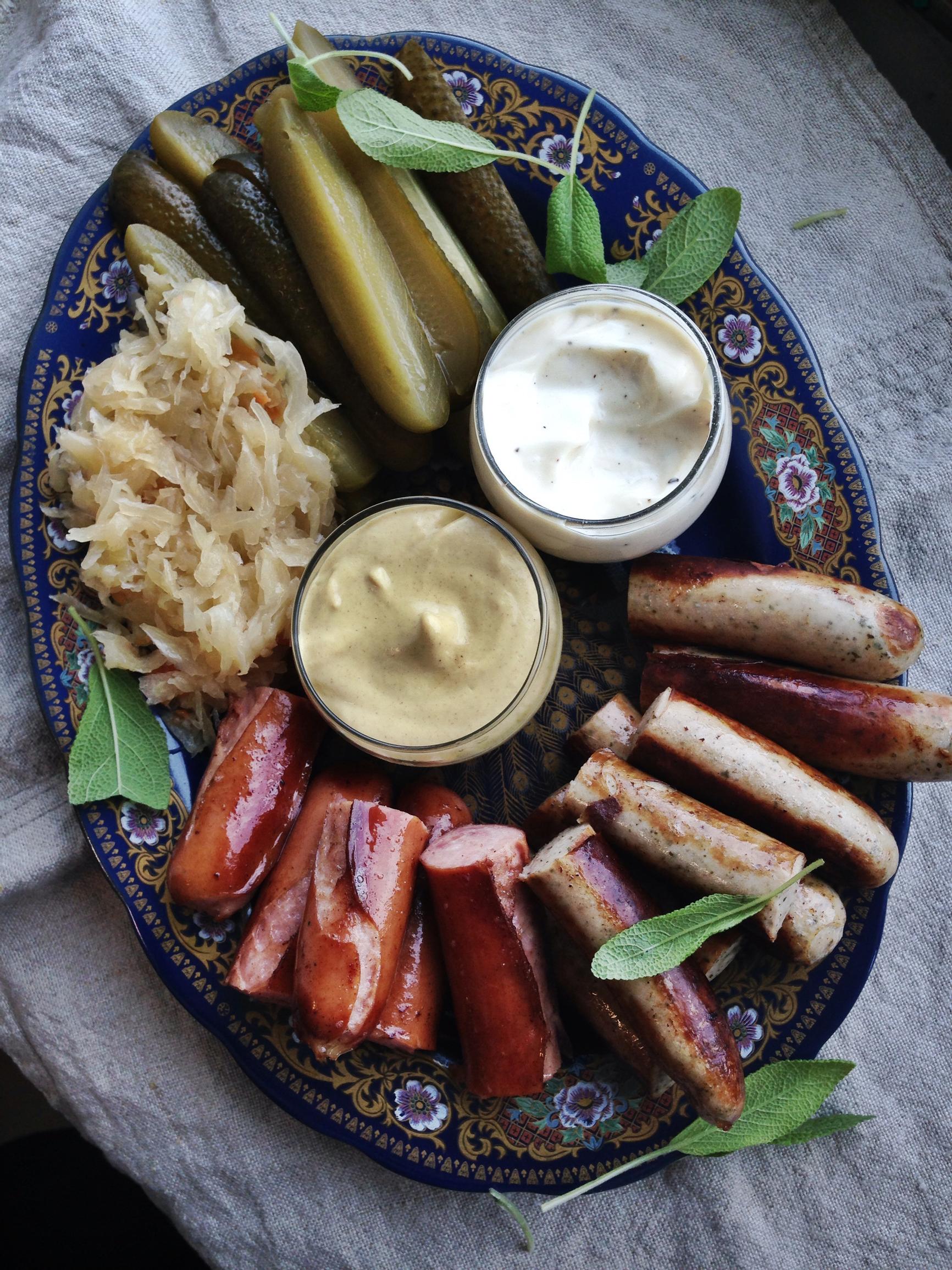 Krakovanmakkarat ja braatvurstit kaipaavat seurakseen sinapin lisäksi itsetehtyä majoneesia ja oluessa ja hunajassa haudutettua hapankaalia. Katso VIDEO, kuinka makkaralautanen valmistuu!