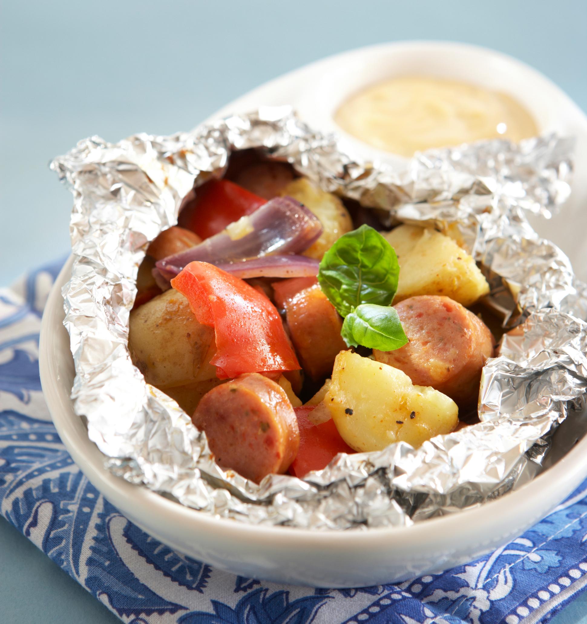 - Sekoita keskenään kasvikset, makkarapalat ja grillikastike. Jaa makkaraseos viidelle foliopalalla ja sulje nyytiksi.