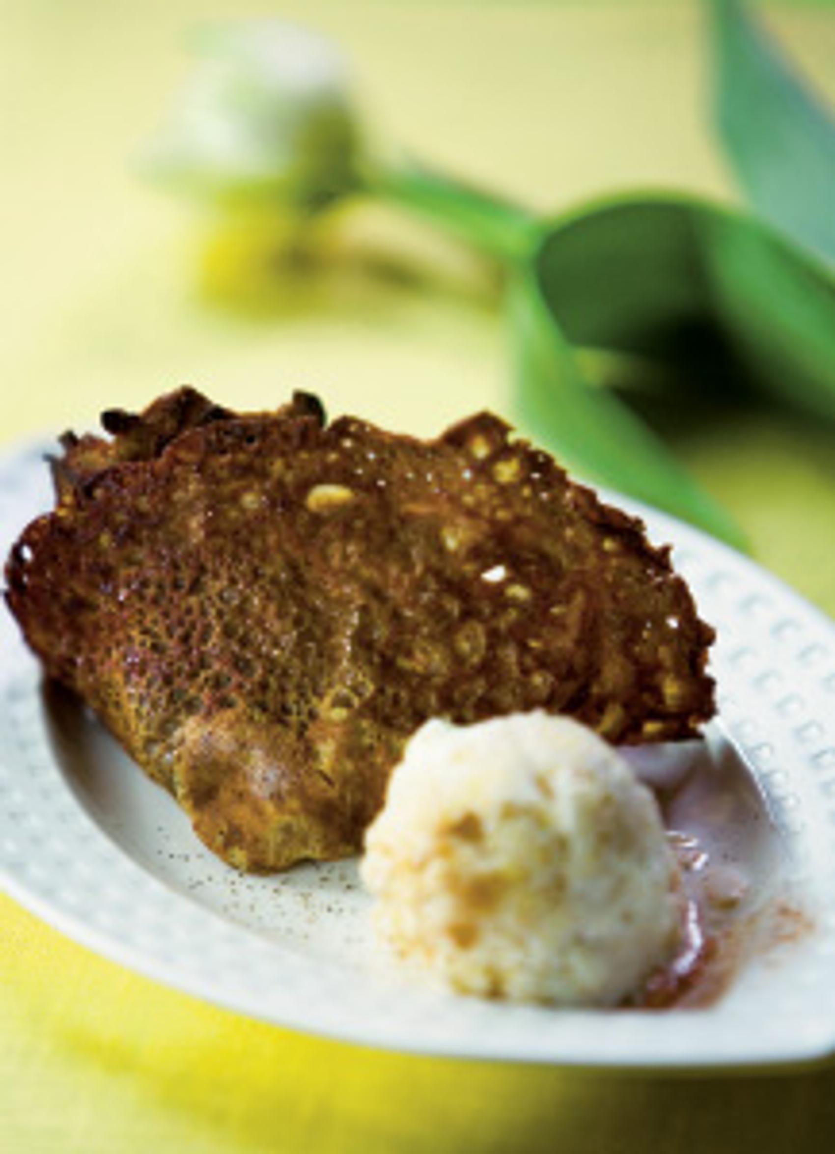 - Sulata nokare rasvaa isossa paistinpannussa ja kaada desin verran taikinaa pannun keskelle. Kallistele pannua niin, että taikina valuu ohueksi kerrokseksi ja muodostaa pitsimäisen reunan kreppiin. Paista kauniin ruskeaksi, käännä ja paista toinen puoli.