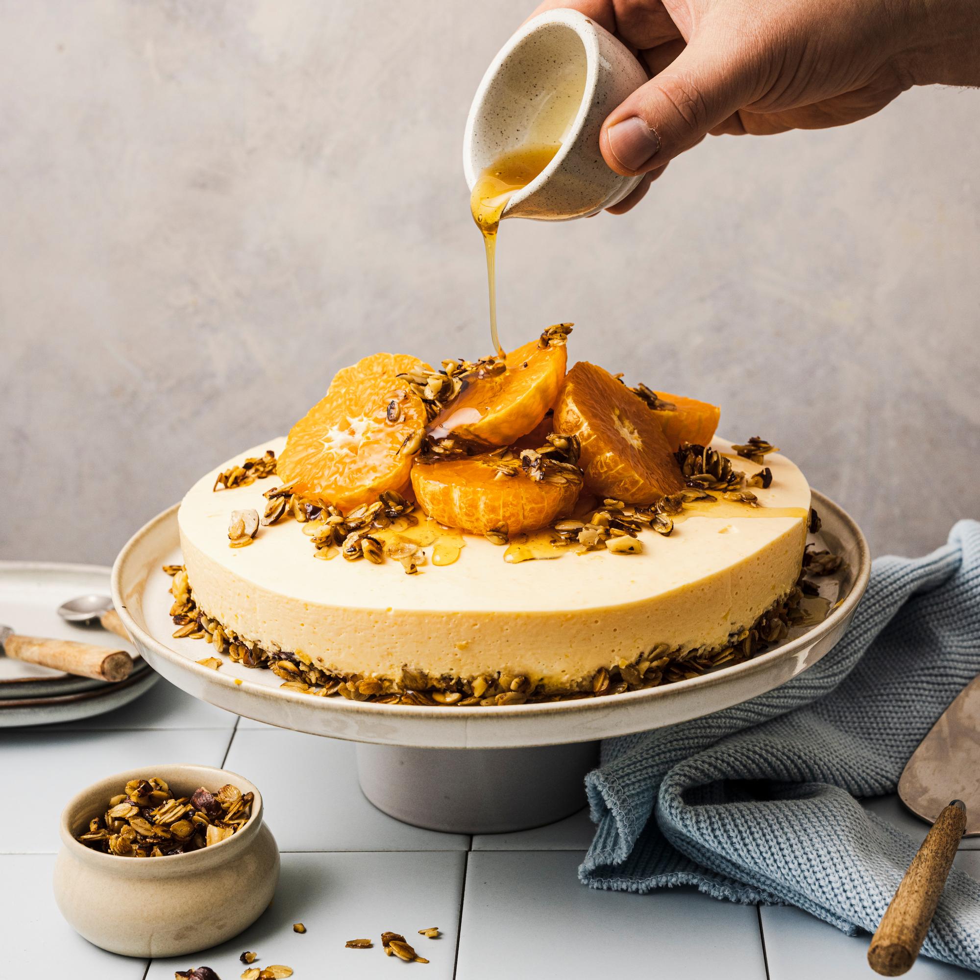 Kokoa aamupalajogurtti sittenkin näyttäväksi kakuksi! Maukkaan kakun pohjana toimii mysli, ja täytteenä on jogurttia ja mandariinisosetta. Koko komeus viimeistellään makealla hunajalla.