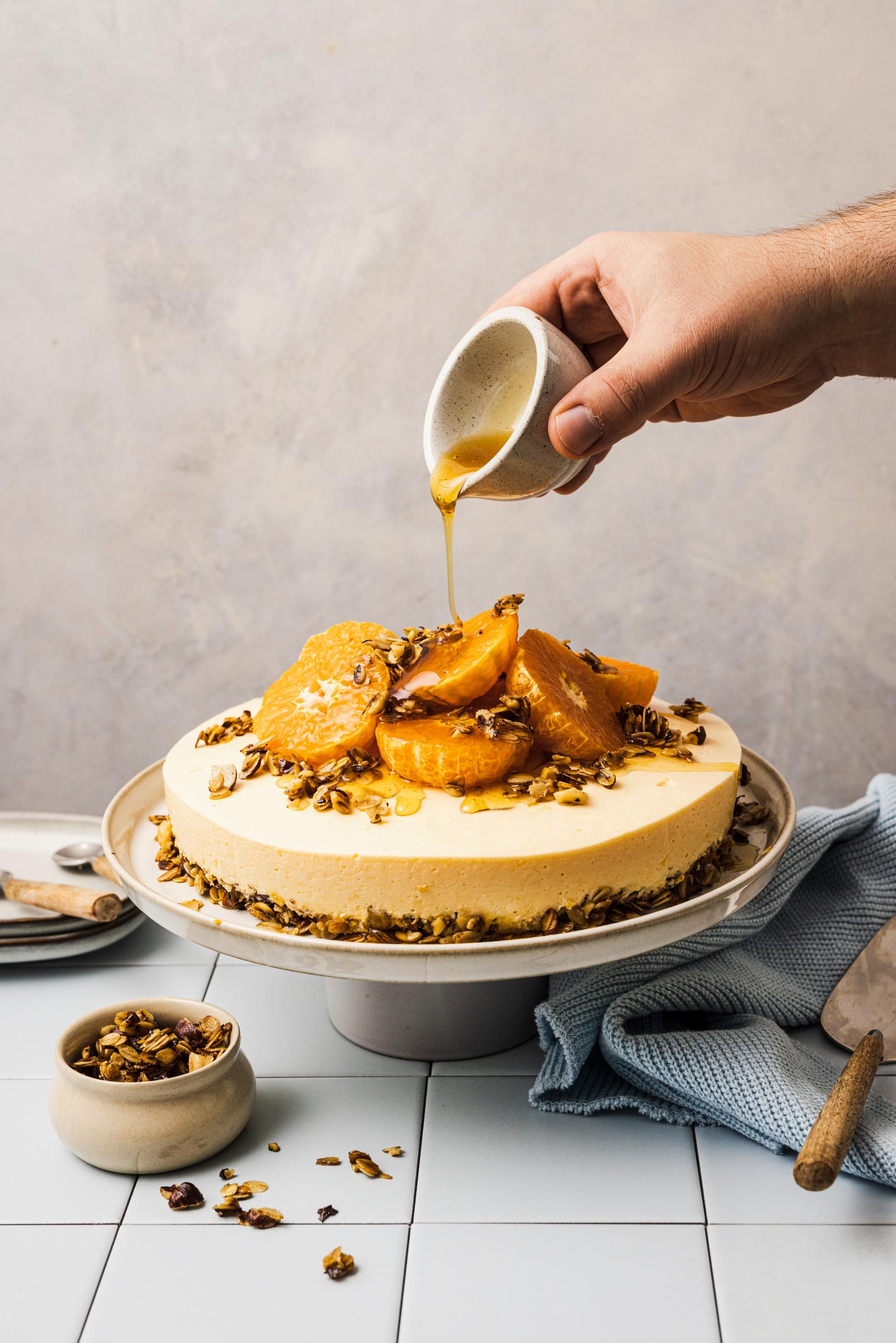 - Irrota kakku vuosta ja laita tarjoiluvadille. Koristele kuorituilla ja halkaistuilla mandariineilla. Ripottele päälle loput kaura-pähkinämurusta. Valuta päälle hunajaa.