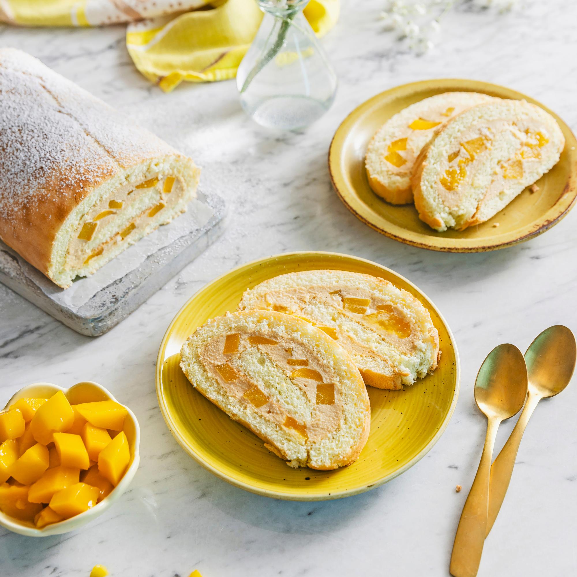Mangokääretortun täytteenä hurmaavat paahdetulla valkosuklaalla maustettu jogurttivaahto ja raikkaat säilykemangopalat. Pyöräytä raikas rulla vaikka keväiseen kahvipöytään – tällä yllätät kaikki!