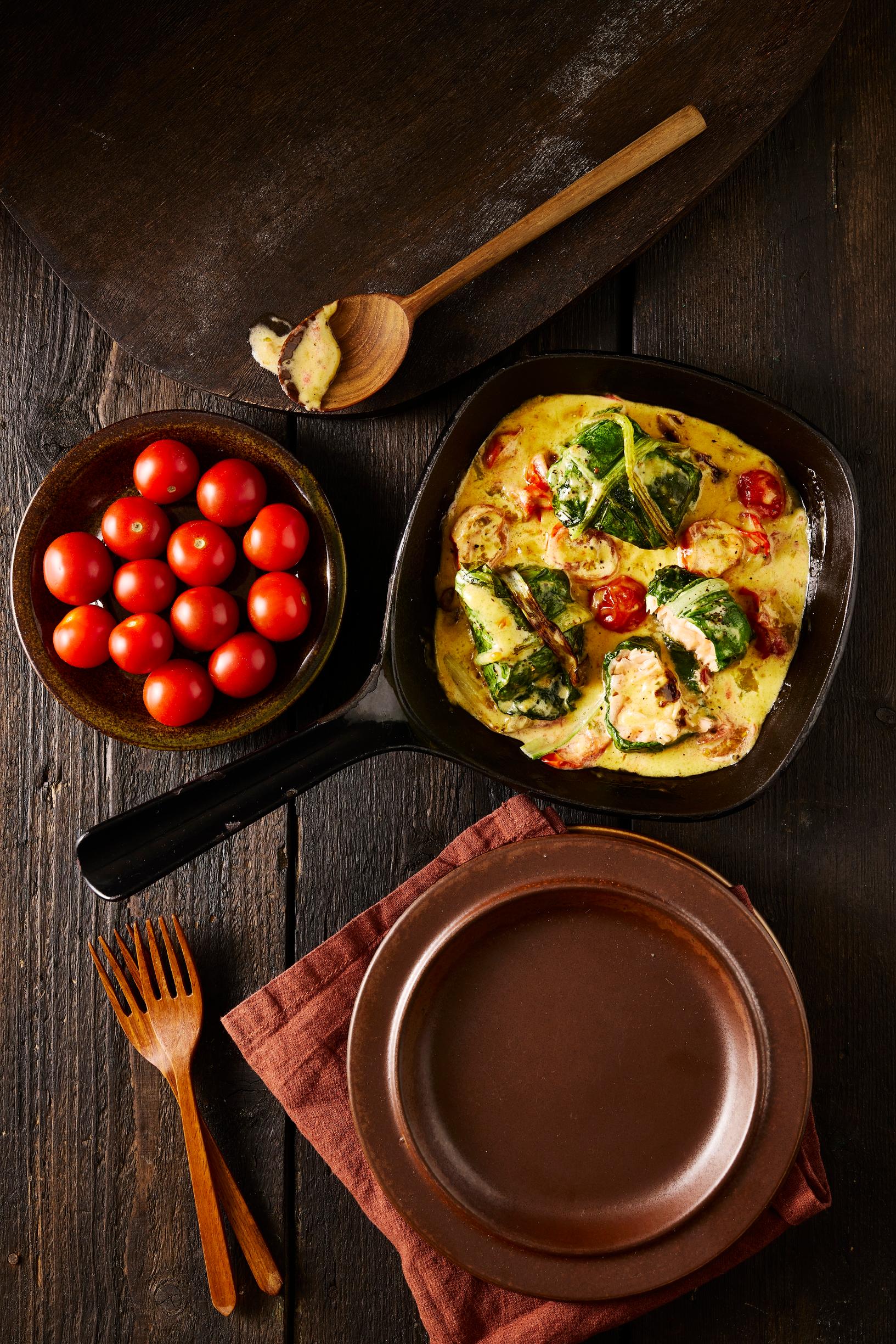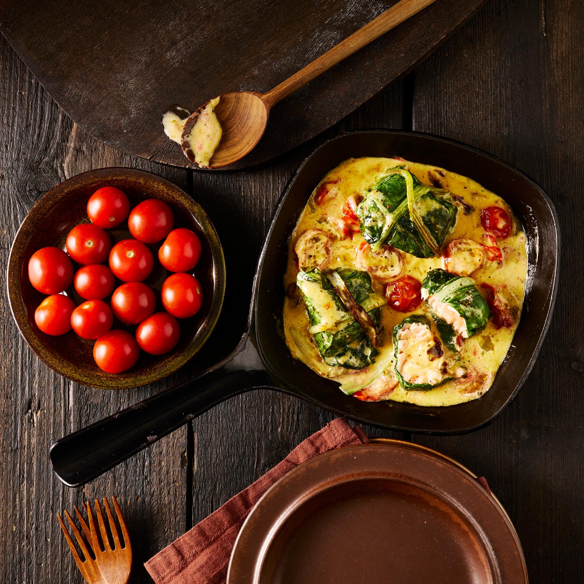 Mangoldi-kalakääryleet ovat näppärä ruoka, sillä yhdellä kertaa valmistuu kala, lisuke ja soosi! Kalarullat kypsyvät pannulla nopeasti ensin paistettuna ja lopulta miso-kermakastikkeessa haudutettuna.