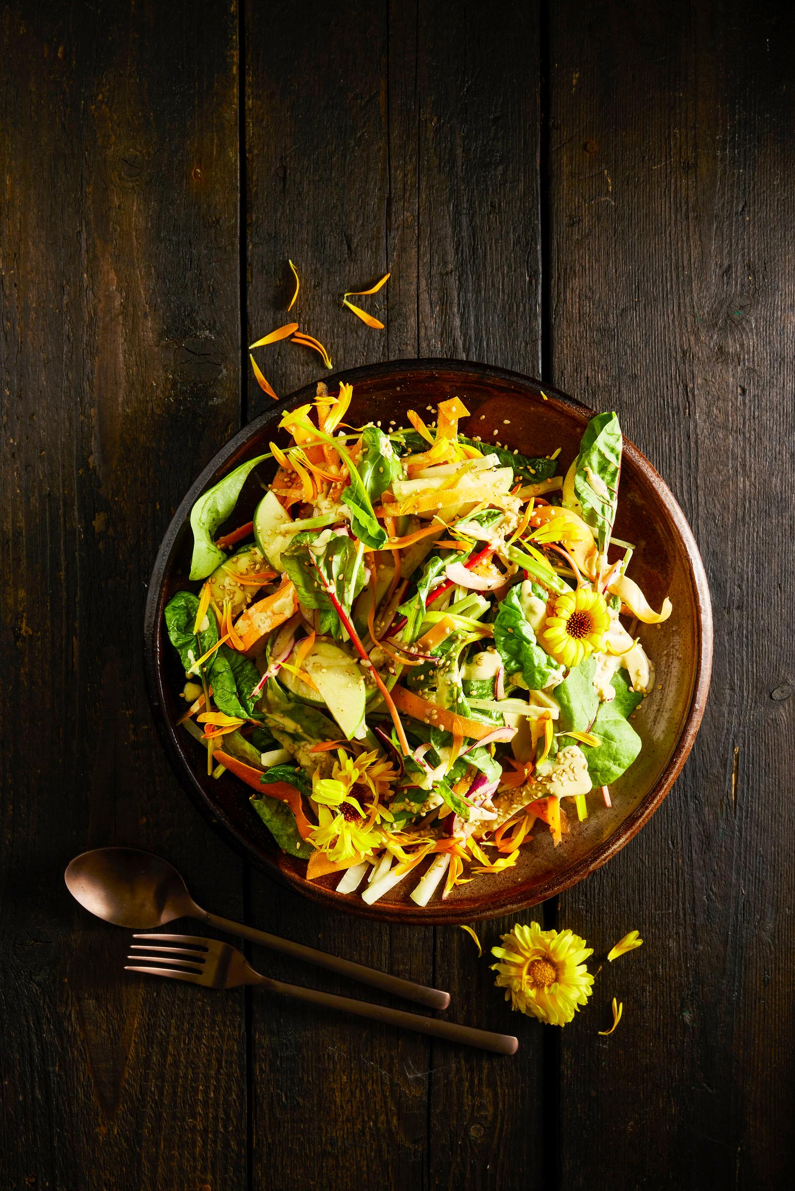 - Yhdistä kastikkeen ainekset sauvasekoittimen kulhossa ja soseuta. Sekoita kastike salaattiin, lisää siemenet ja kukat.