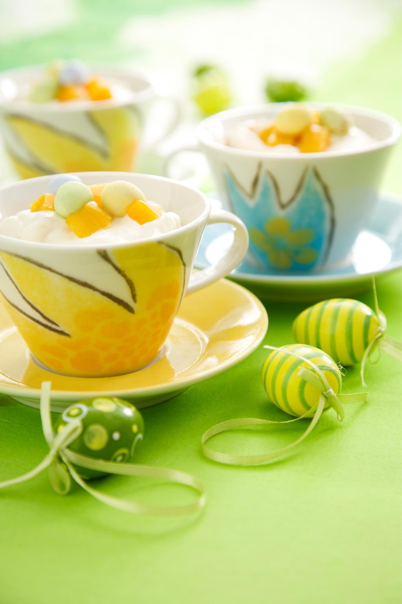 Koristele juuri ennen tarjoilua pääsiäiskarkeilla ja mangokuutioilla.
