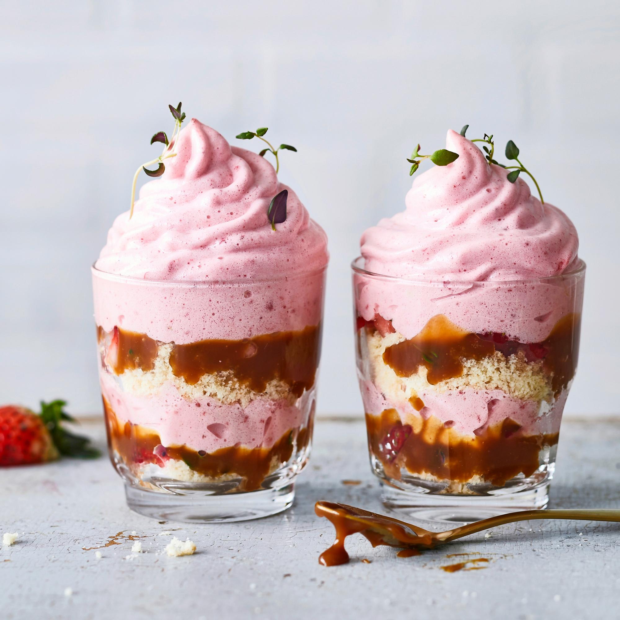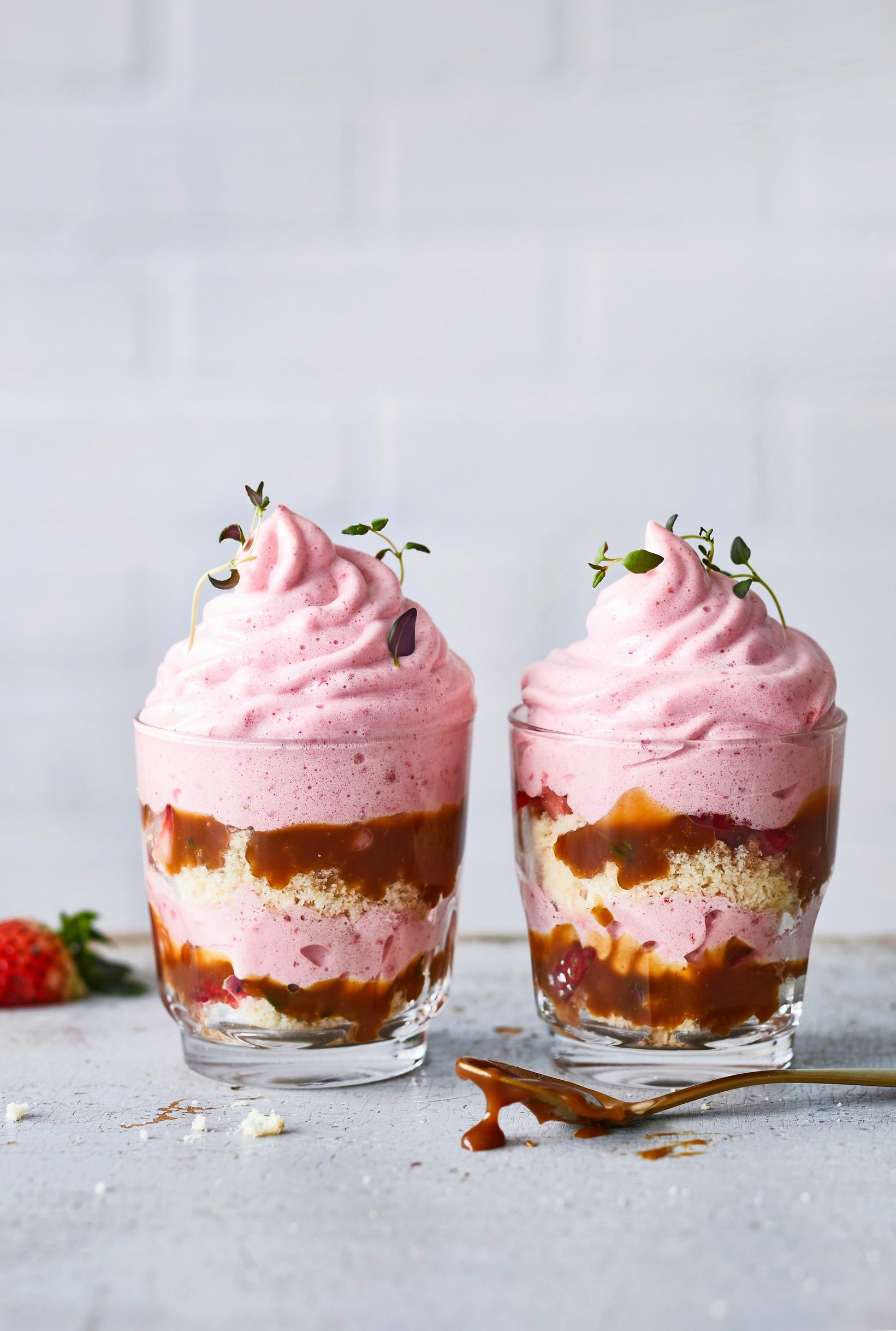 Mansikka-kinuskikakut lasissa – kuohkea kerrosjälkiruoka yhdistää ihanasti kakkumurun, kinuskin ja sorbettimaisen mansikkavaahdon