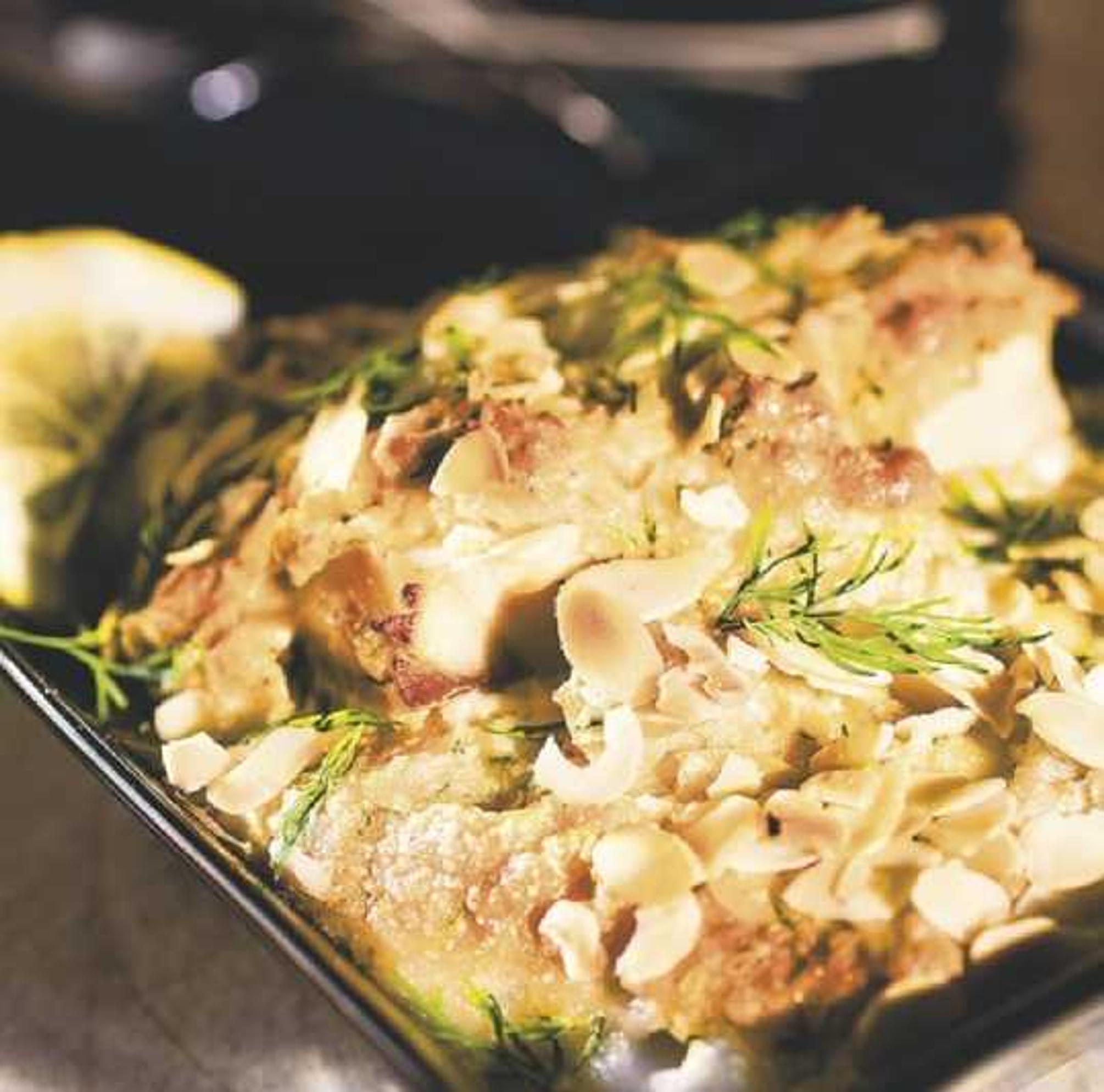 Levitä kalan päälle manteliseos, ripottele pintaan loput mantelilastut ja kypsennä mantelikalaa 200-asteisessa uunissa noin puoli tuntia.