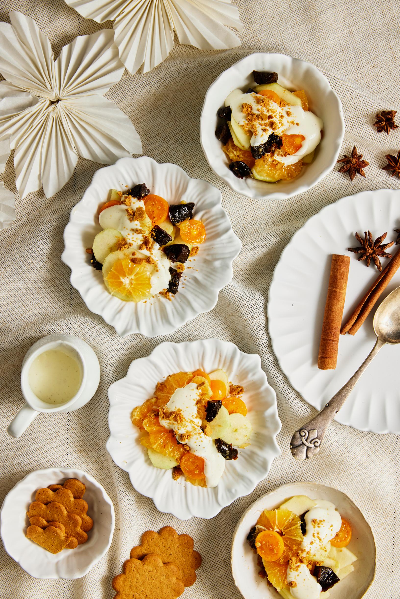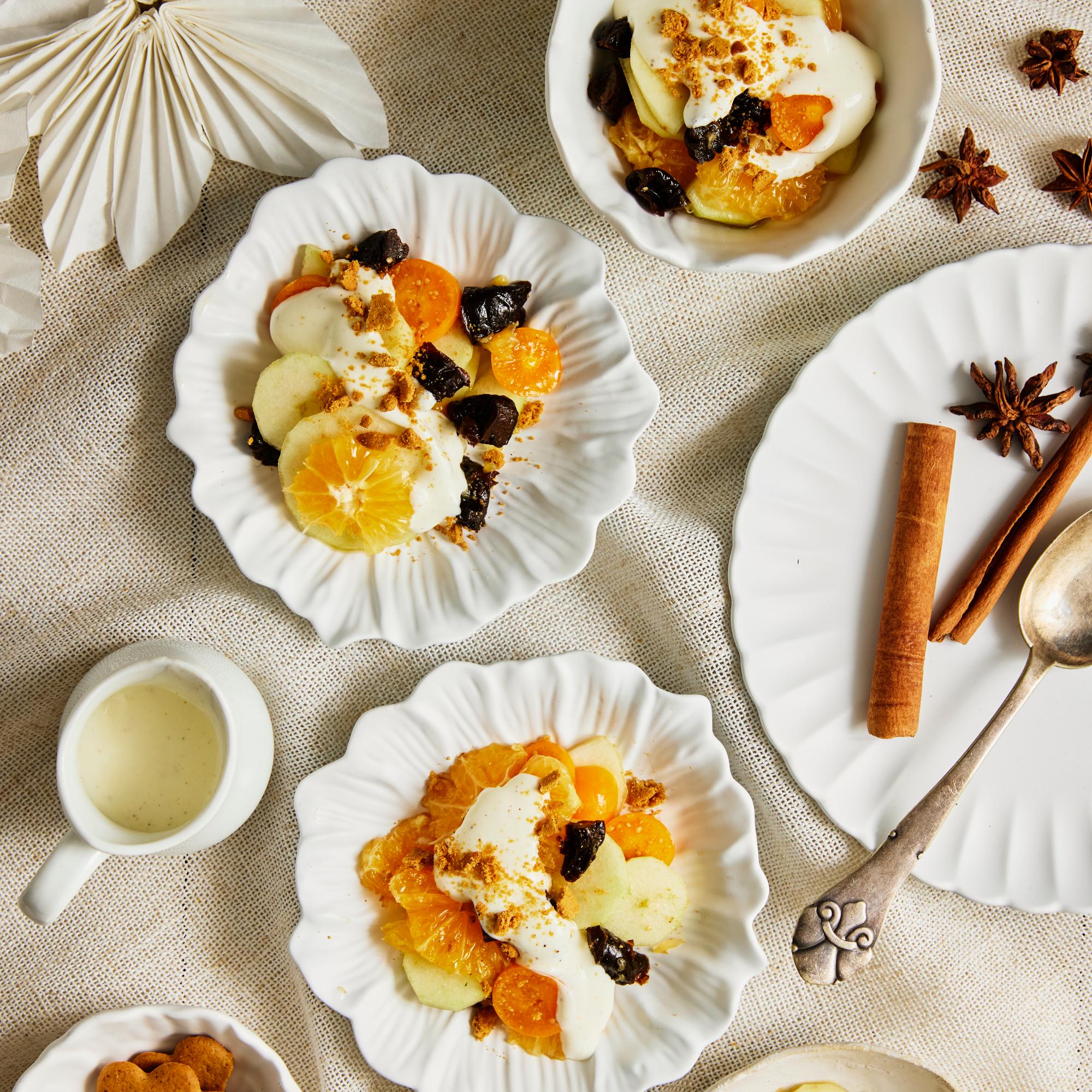 Marinoidut jouluhedelmät ja kanelinen rahkavaahto on juhlapyhien raikkain jälkkäri