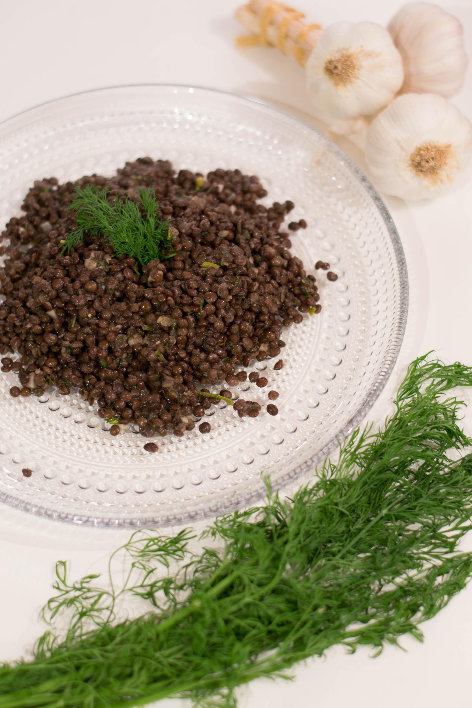 Huuhtele belugalinssit hyvin ja keitä pakkauksen ohjeen mukaan suolatussa vedessä. Linssien keittämisen aikana valmista marinadi. Mittaa kulhoon oliiviöljy, valkoviinietikka, dijon sinappi ja hunaja. Kuori ja hienonna valkosipulin kynsi, lisää marinaadiin. Hienonna tilli ja lisää marinaadiin. Lisää marinaadiin vielä suola ja mustapippuri, sekoita hyvin.