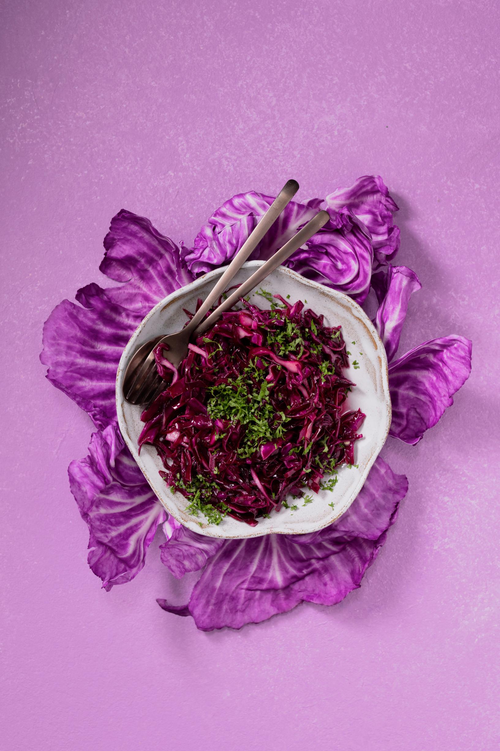 Marinoitu punakaali − mehukkaan lisukesalaatin juju on kaalisuikaleisiin hierottu suola