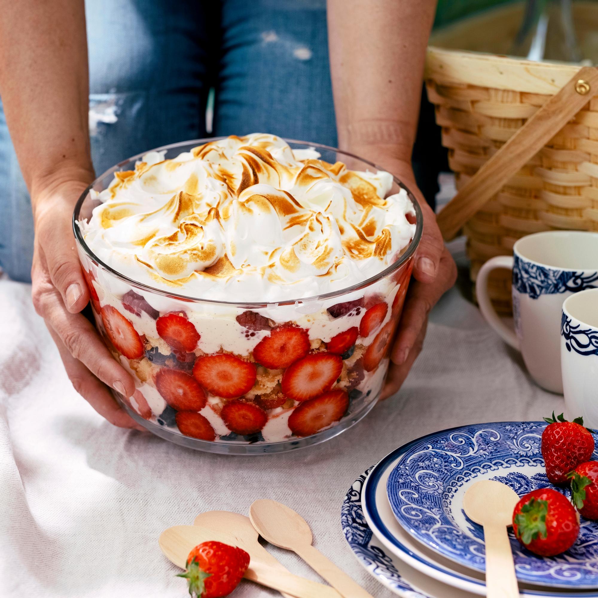 Kesäjuhlien kunniavieras! Tuoreilla mansikoilla täytetty marja-marenkitrifle on rennon tyylikäs kulhokakku