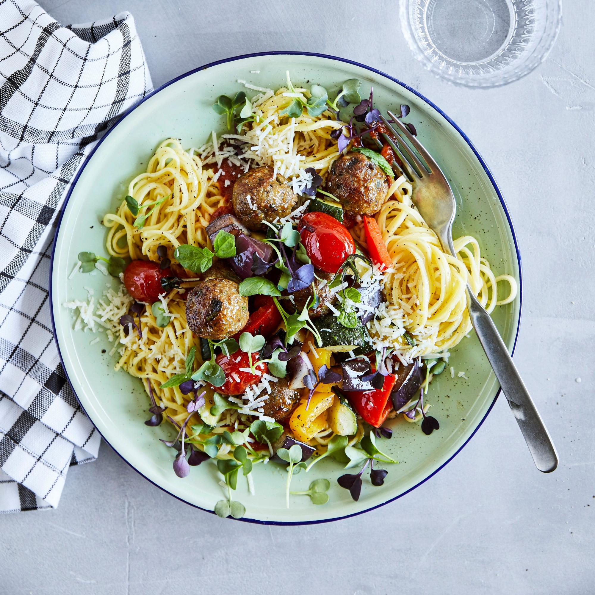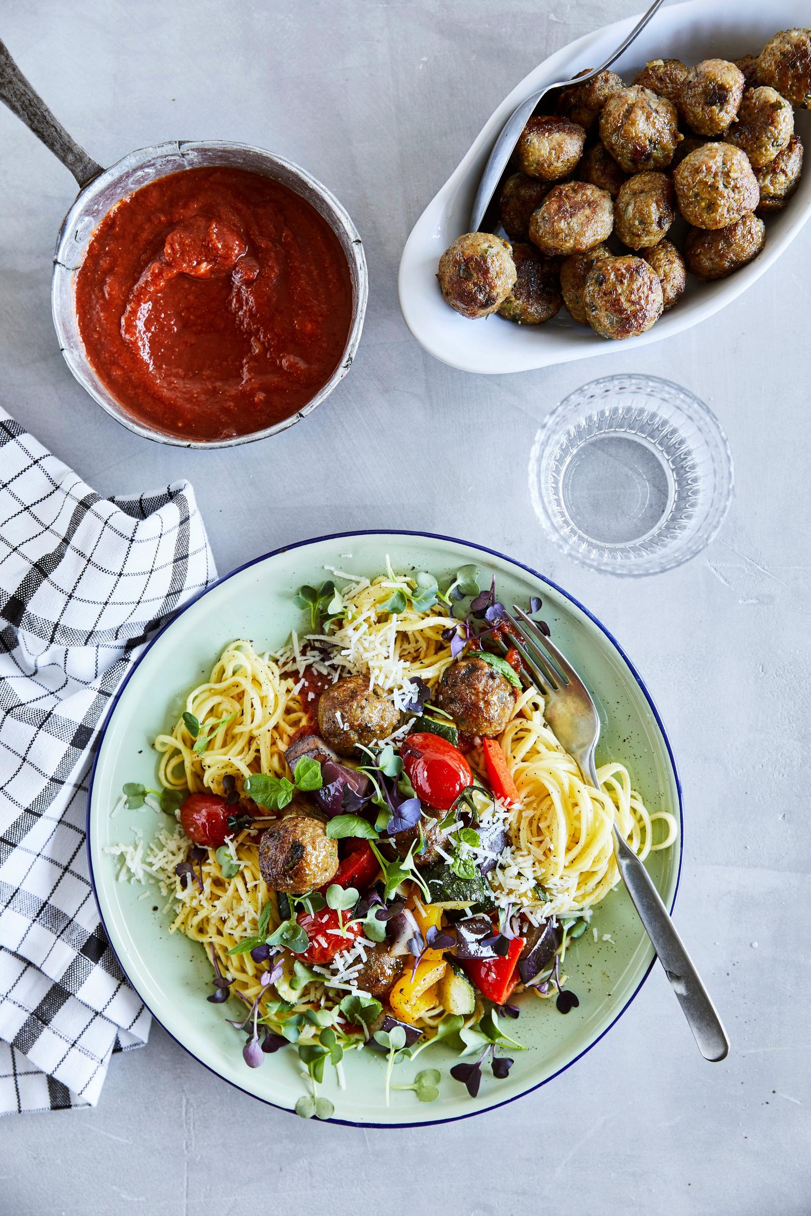 - Keitä tuorespagetti suolalla maustetussa vedessä kypsäksi, noin 3 minuuttia. Valuta ja tarjoa lihapullien ja kasvistaginen kanssa.