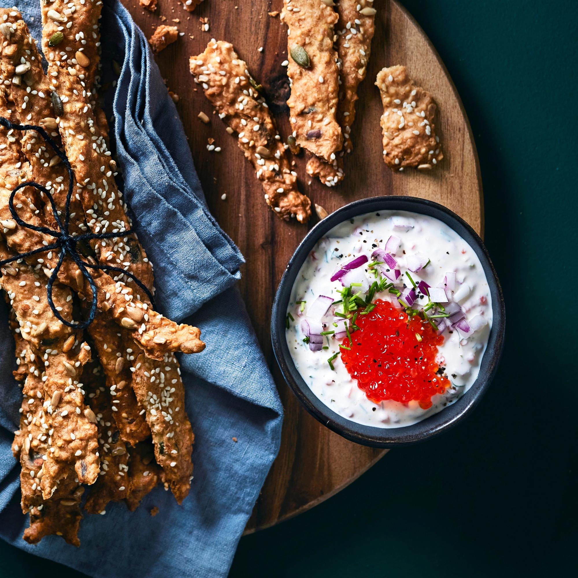 - Paista näkkäriä 150-asteisen uunin keskitasolla tunnin ajan, kunnes se on rapeaa. Anna jäähtyä ja paloittele. Tarjoa kauranäkkäritikut mätidipin kanssa.