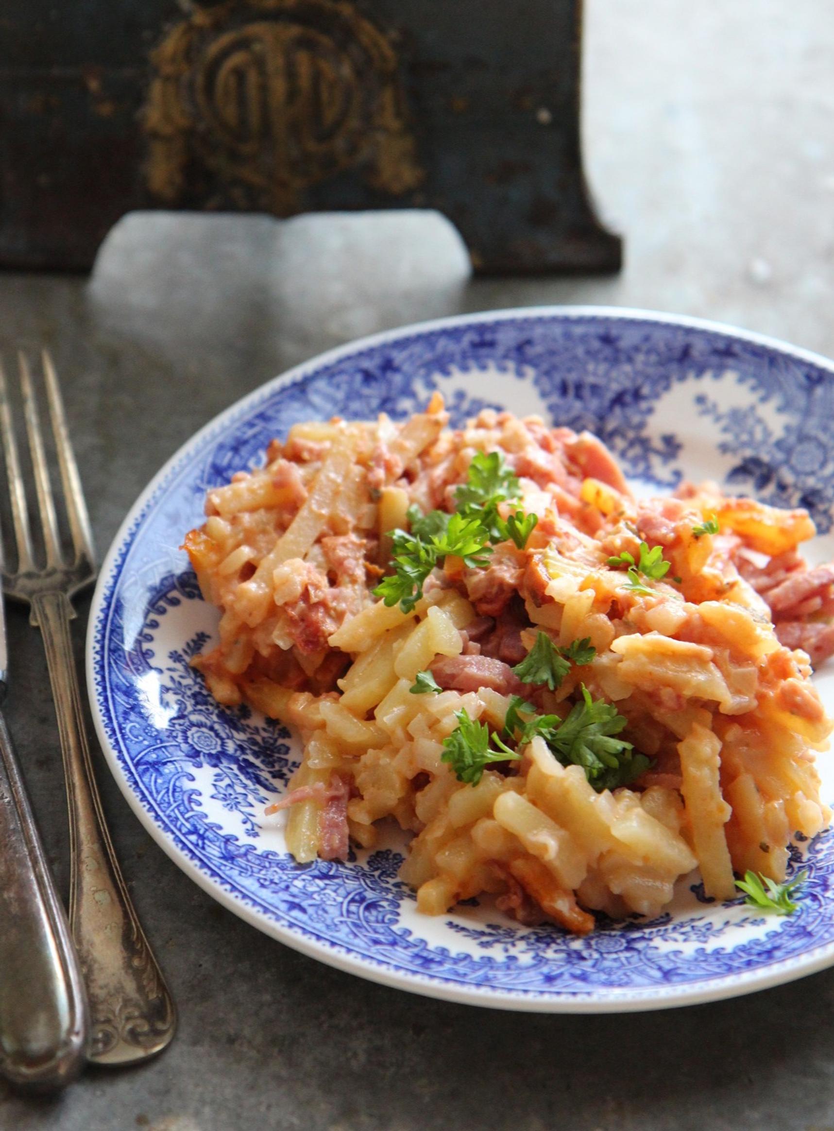 Nopeasti valmistuva kinkkulaatikko, johon makua antavat sinihomejuusto ja suolakurkku. Kun mausteena on vielä timjamia ja rosmariinia on arkinen ruoka melkein luksusta.