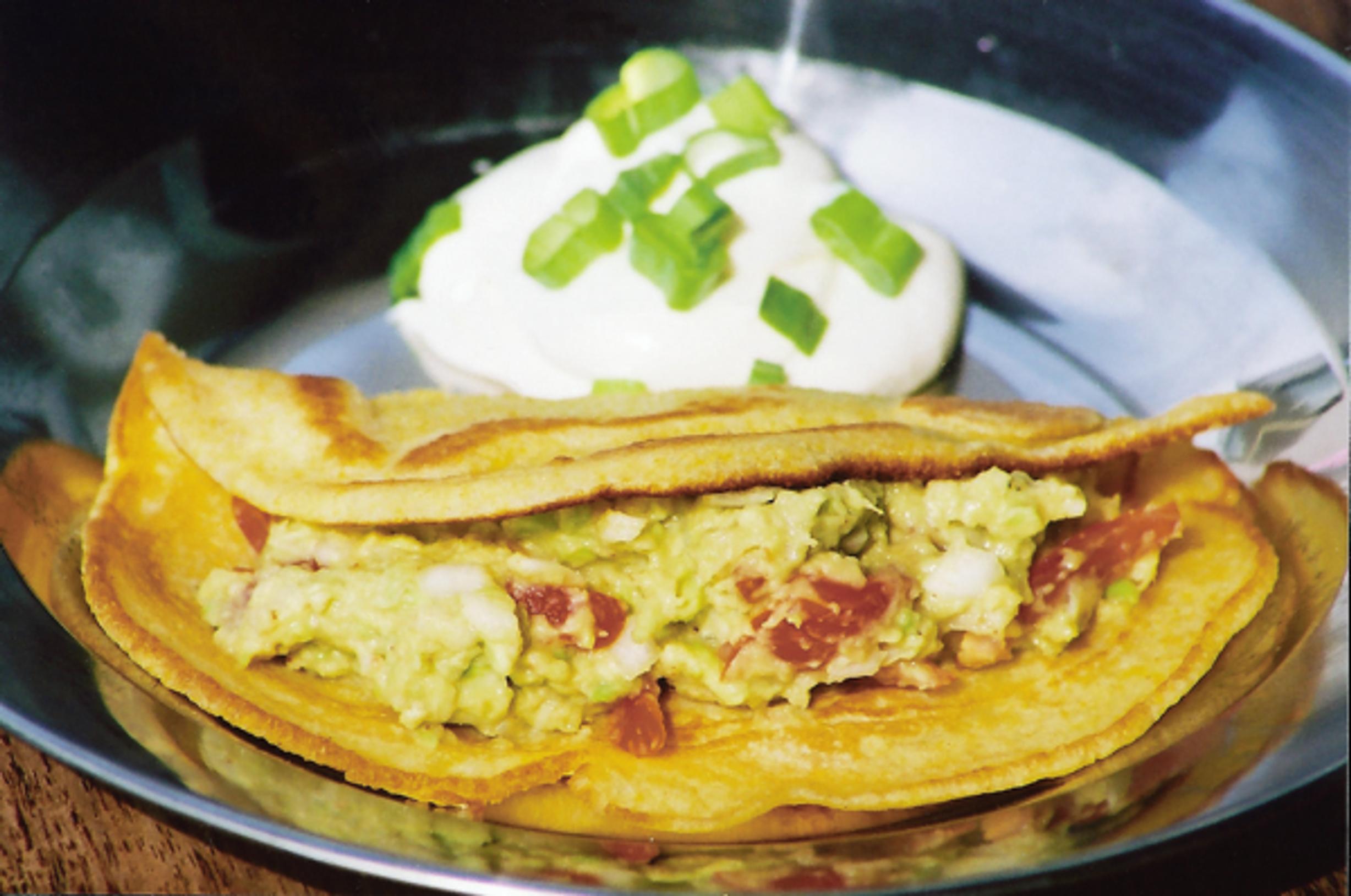 Lusikoi täytettä letulle, taita keskeltä kahtia. Tarjoa ranskankerman ja lopun sipulisilpun kanssa.