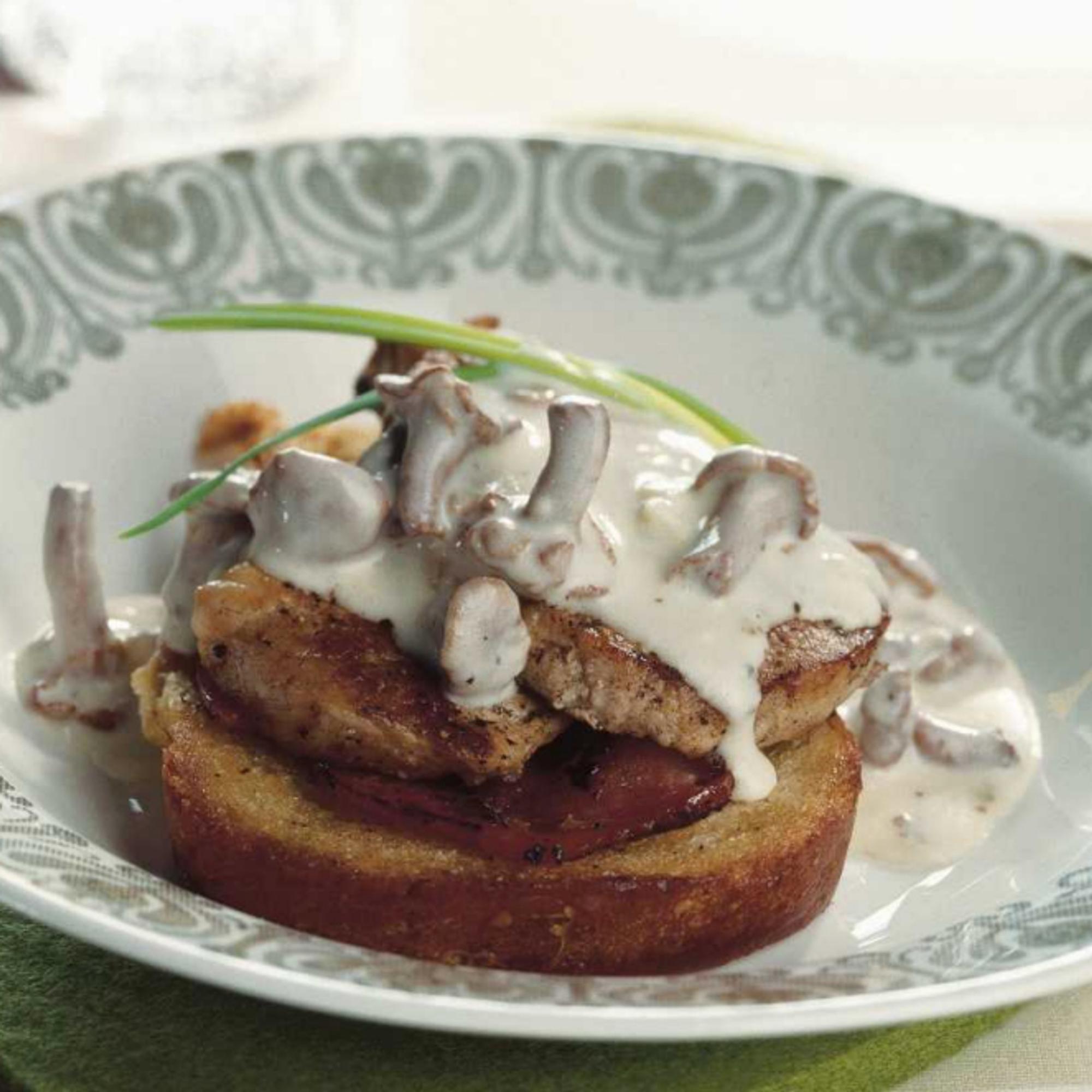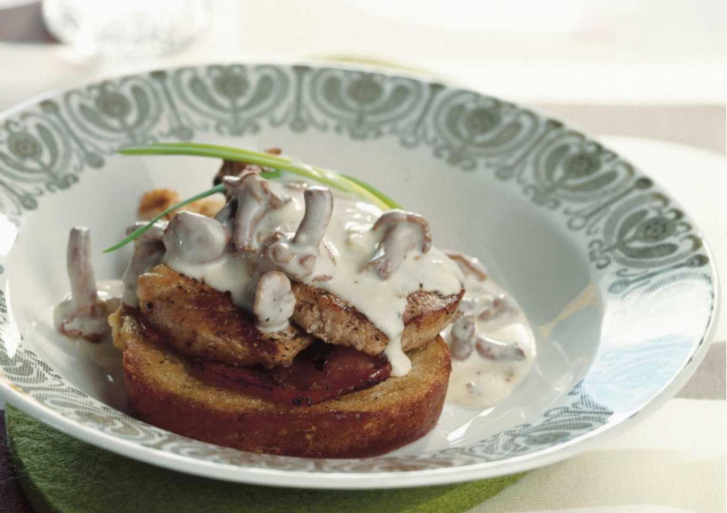 - Kokoa metsästäjänleivät lämmitetyille lautasille. Nosta leipäviipaleiden päälle pekoni ja lihat. Jaa sienikastike tasaisesti lihojen päälle. Koristele kevätsipulilla tai ruohosipulilla. Tarjoa heti lämpimänä.