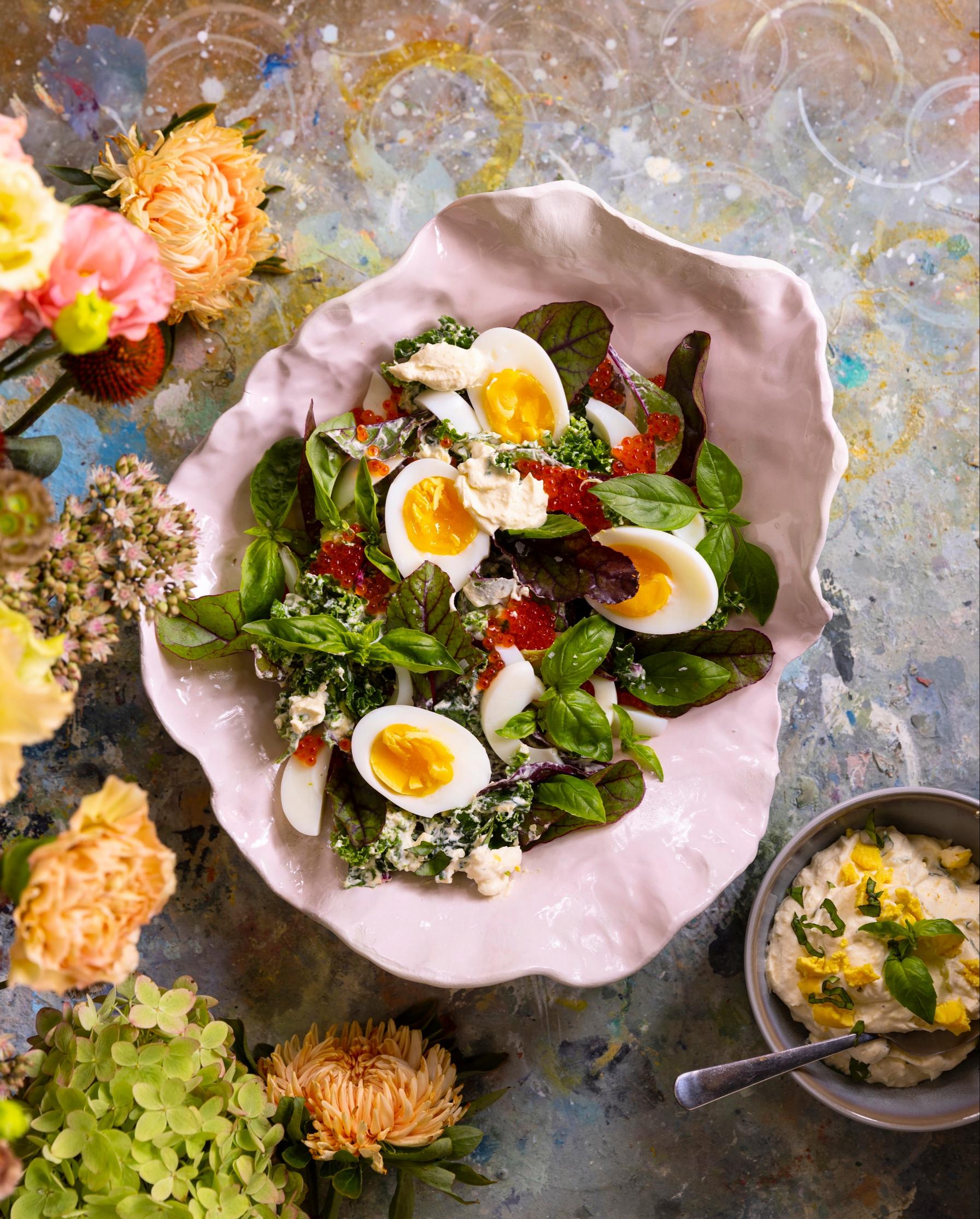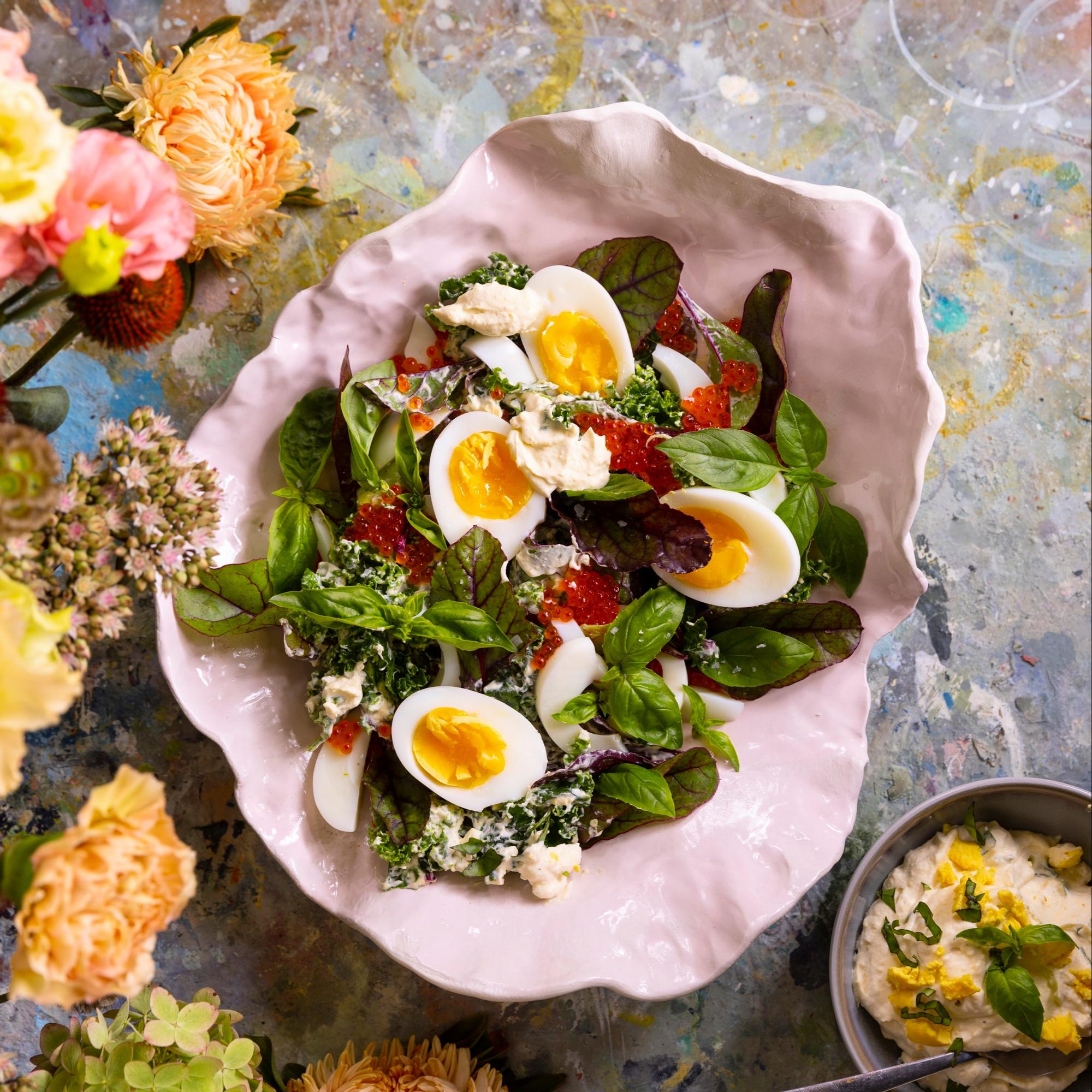 - Siirrä salaatti tarjoiluastiaan. Lusikoi mäti salaatin päälle ja koristele basilikalla. Kuori ja halkaise pehmeäksi keitetyt munat ja lisää ne salaatin pinnalle. Tarjoa loppu kastike salaatin kanssa.