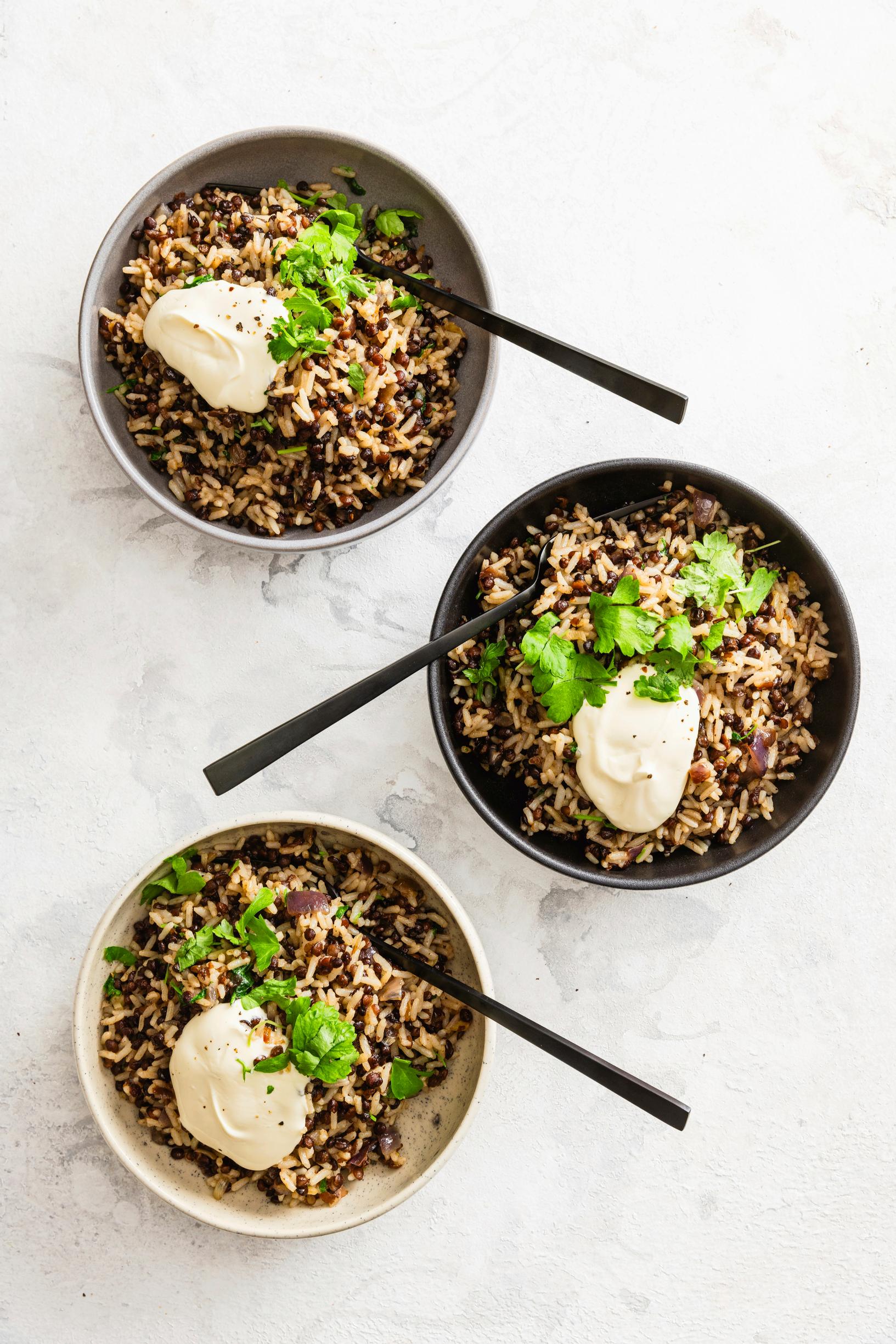 Hieman vaatimattoman näköinen mujadara yllättää syvän täyteläisellä maulla. Täysjyväriisi ja belugalinssit täyttävät vatsan ja pitävät nälän loitolla.
