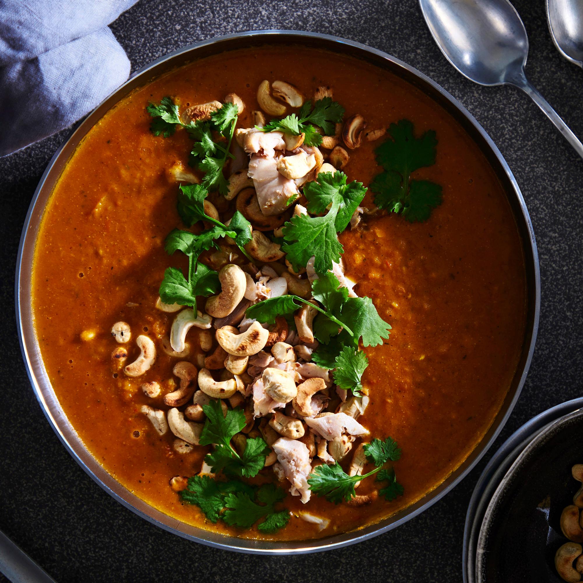 - Lisää broilerit keittoon, osan voi ripotella myös keiton päälle. Tarjoa paahdettujen cashewpähkinöiden ja korianterin kanssa.