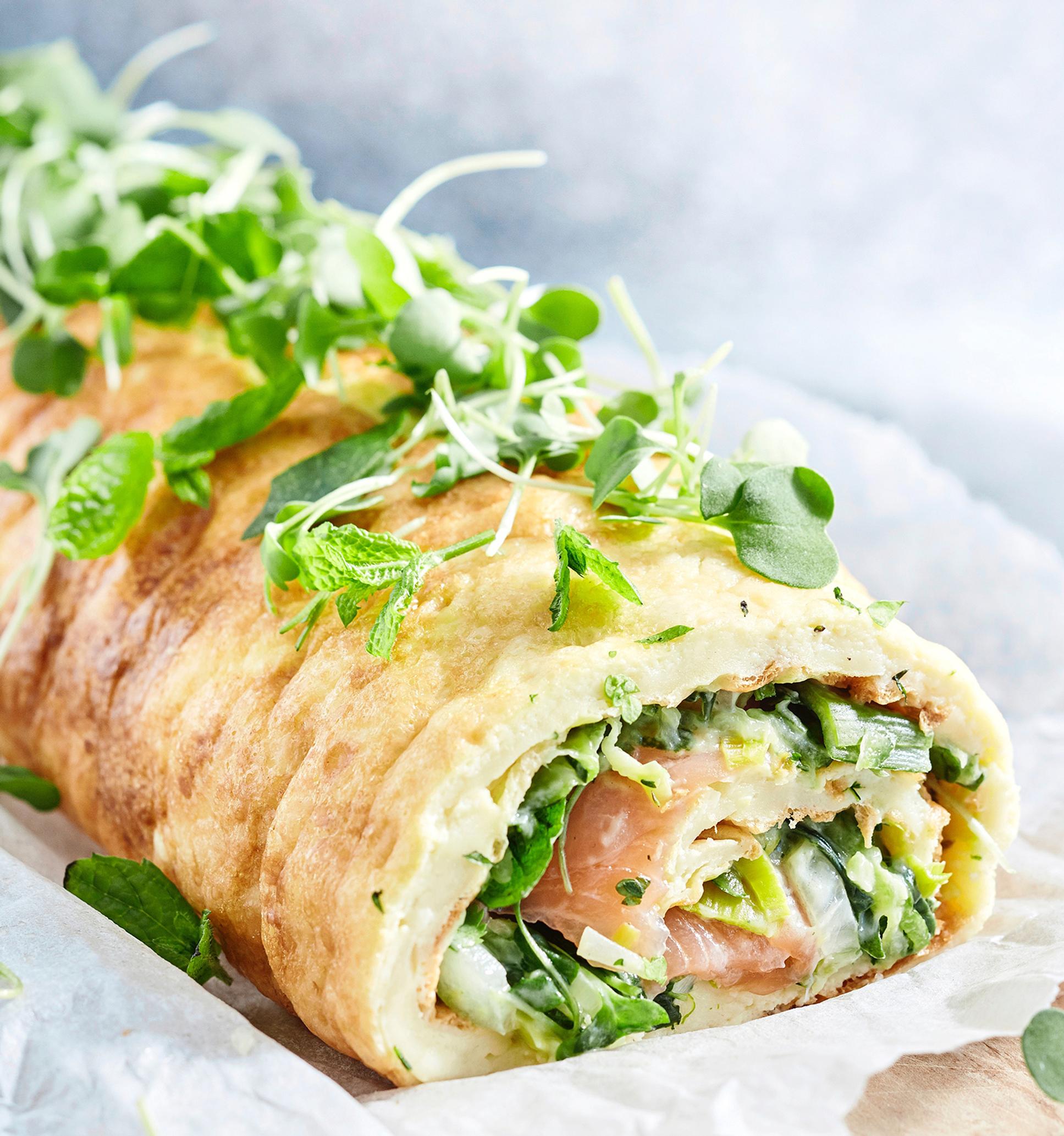Kääräise uunimunakas rullalle ja täytä lohella ja keväisellä kasvis-sulatejuustotäytteellä. Helppoa, täyttävää ja hyvää. Munakasrulla maistuu kylmänä ja lämpimänä.