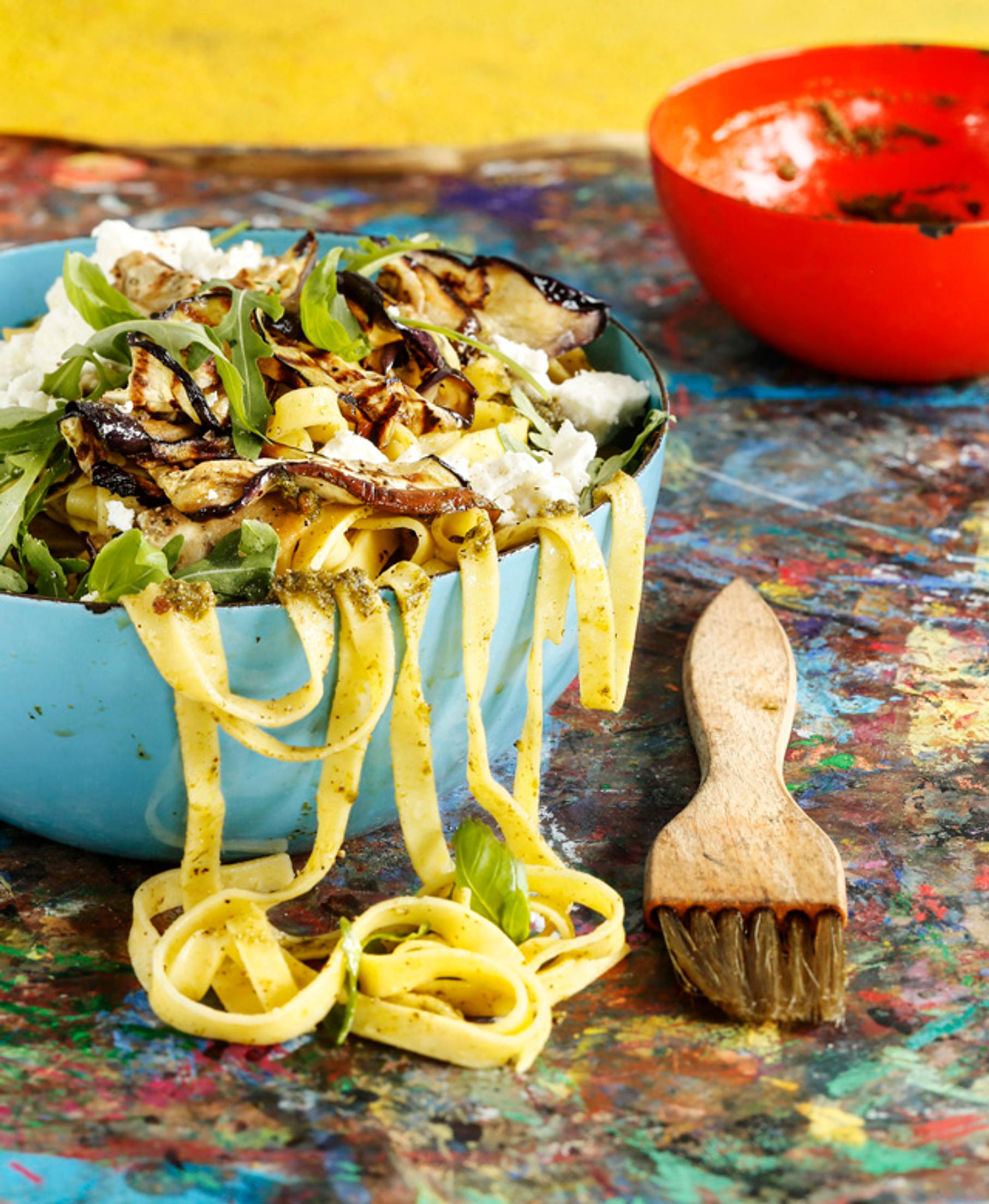 3. Keitä tuorepasta suolalla maustetussa vedessä kypsäksi pakkauksen ohjeen mukaan. Valuta pasta lävikössä. Kaada pasta kulhoon ja sekoita joukkoon pesto, munakoisot ja murusteltu fetajuusto. Lisää joukkoon huuhdottuja rukolanlehtiä ja basilikaa. Tarjoile munakoiso-fetapasta heti.