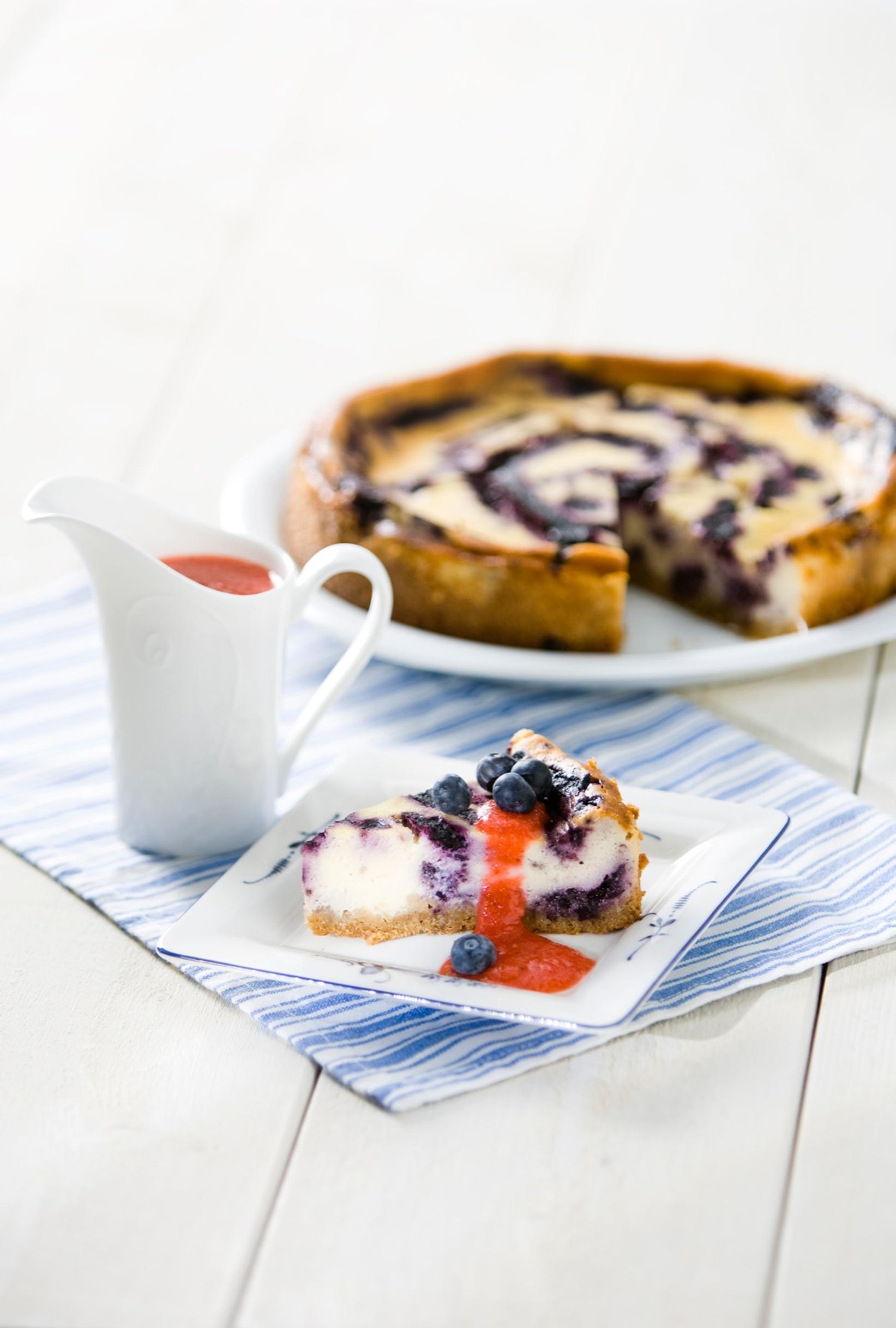 Ihana mustikkajuustokakku saa värinsä ja makunsa juustotäytteen ja mustikkatäytteen yhdistelmästä! Kakun kruunaa makeankirpeä mansikka-limettikastike.