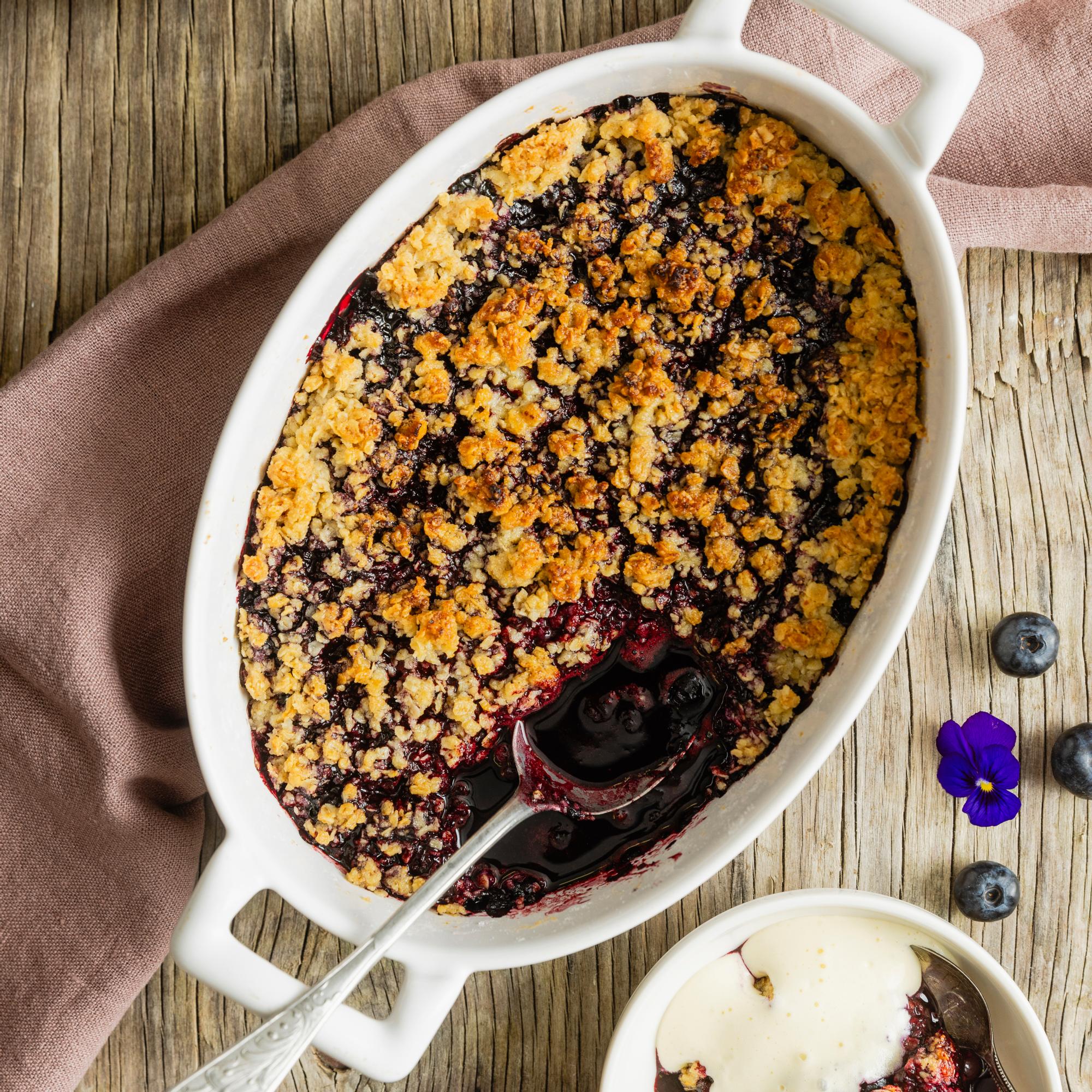 Mustikka-kaurapaistos on jälkiruokien klassikko, kuin mustikkapiirakka väärin päin! Vuoan pohjalle ladotaan runsaasti mustikoita ja päälle ripotellaan kaurainen muruseos, joka paahtuu uunissa kullanruskeaksi ja rapeaksi. Tarjoile paistos vaniljakastikkeen tai -jäätelön kera!